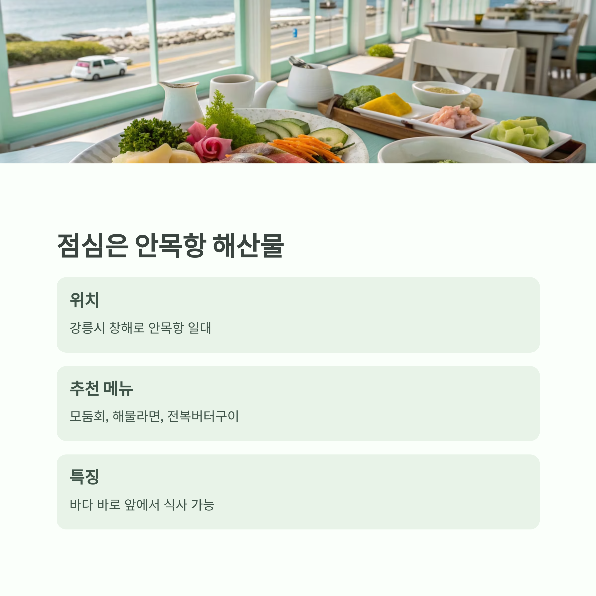 | 특징 | 바다 바로 앞에서 식사 가능 |