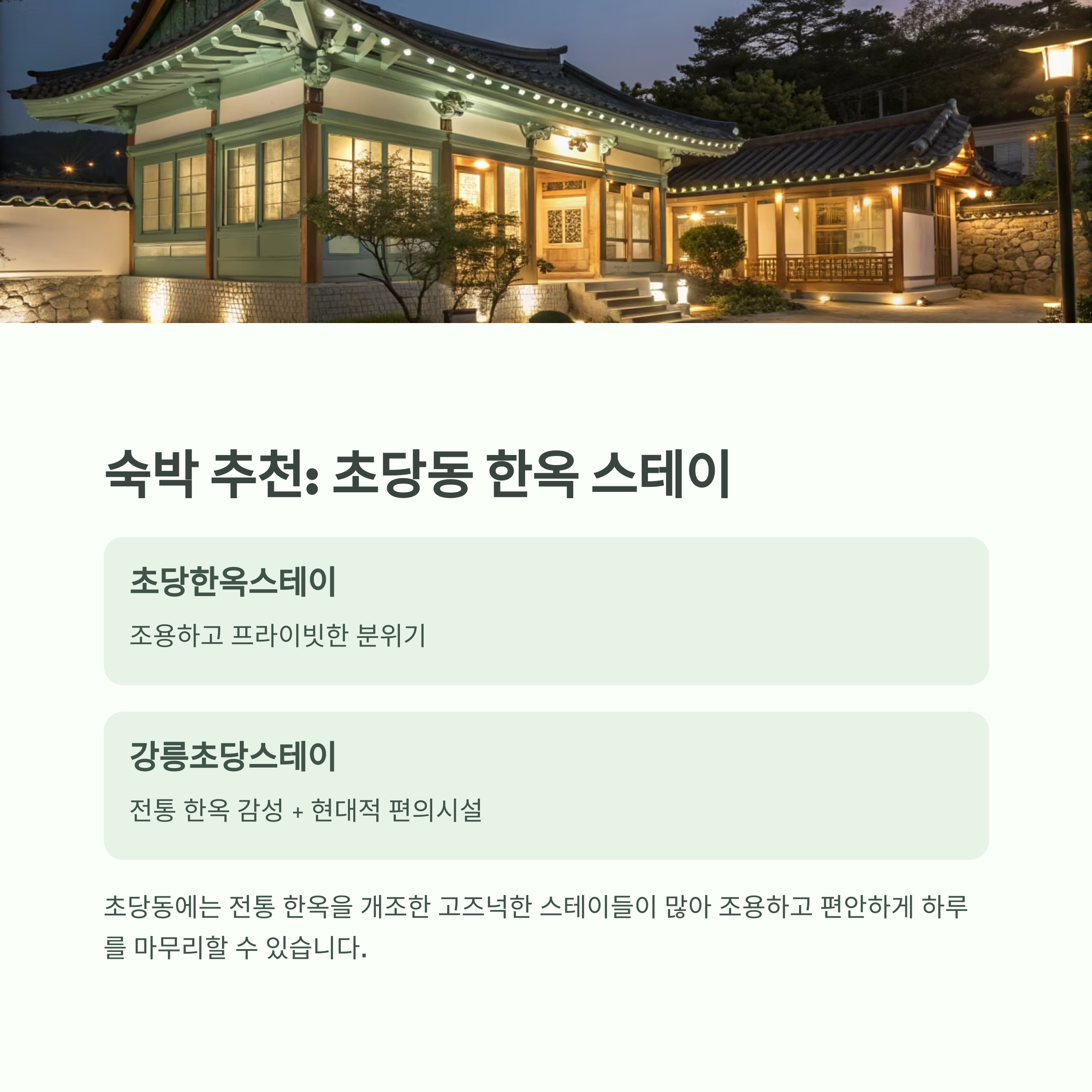 | 강릉초당스테이 | 전통 한옥 감성 + 현대적 편의시설 |