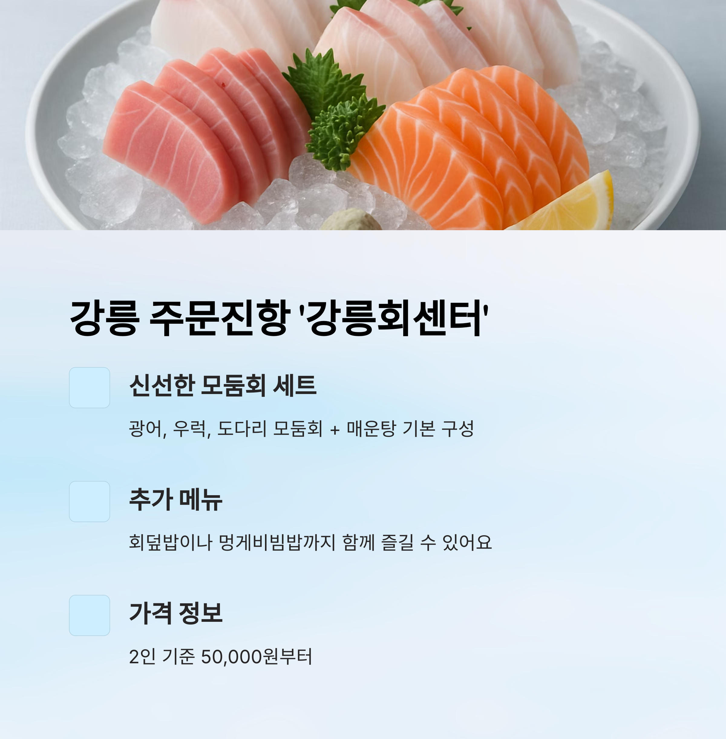 | 대표 메뉴 | 모둠회 세트 2인 50,000원~ |