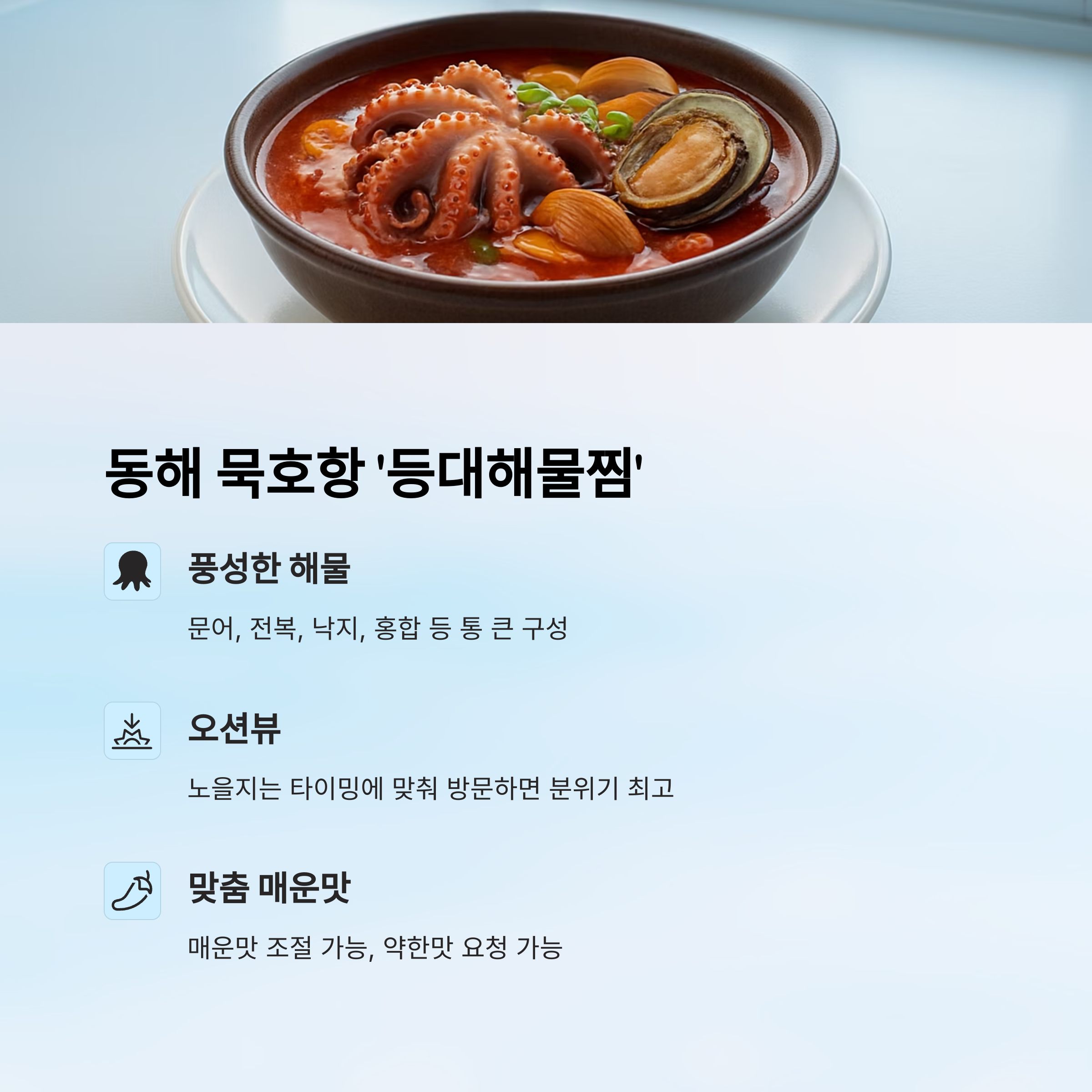 | 포인트 | 오션뷰 테이블 + 매운맛 조절 가능 |