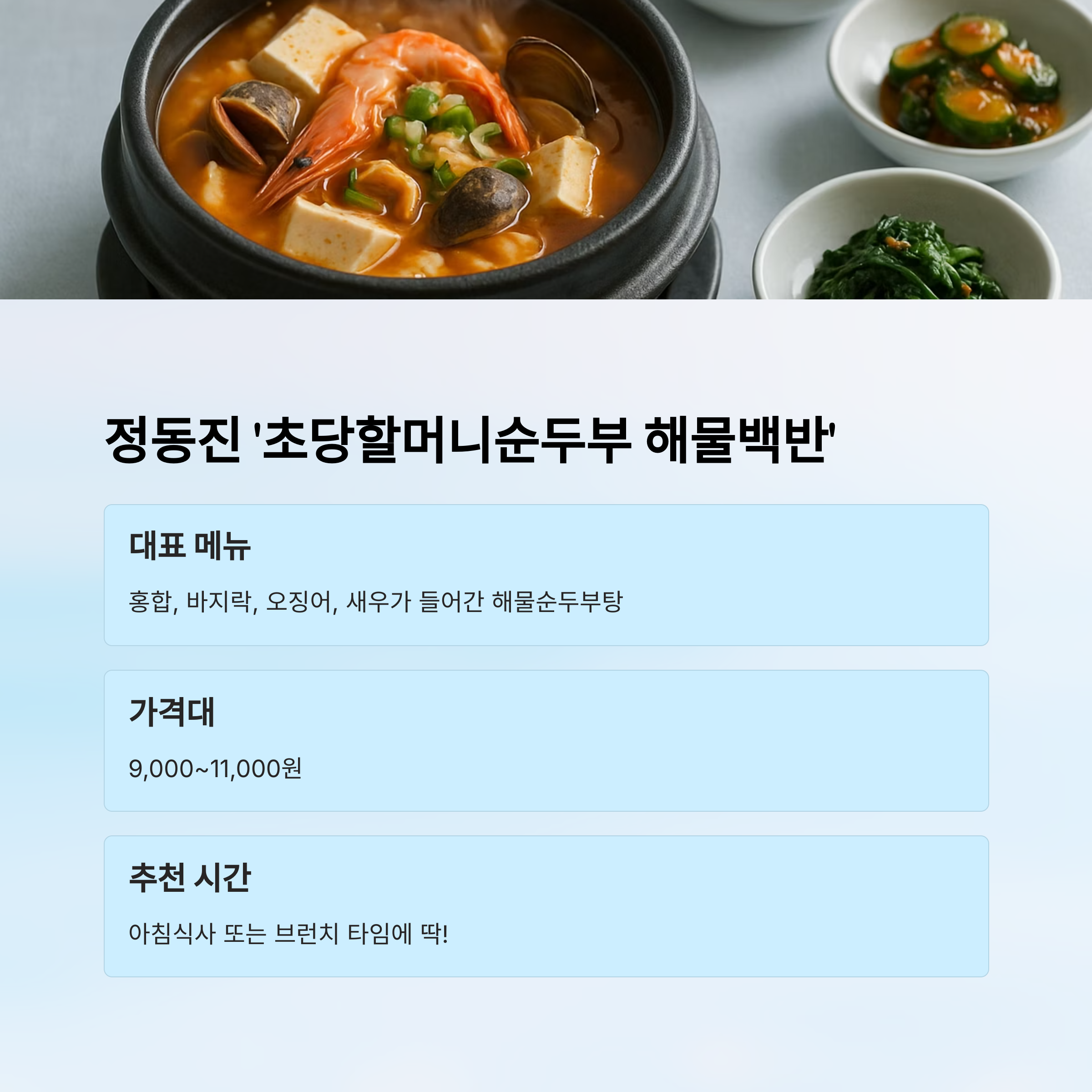 - 추천 메뉴: 해물순두부백반 + 오징어젓갈