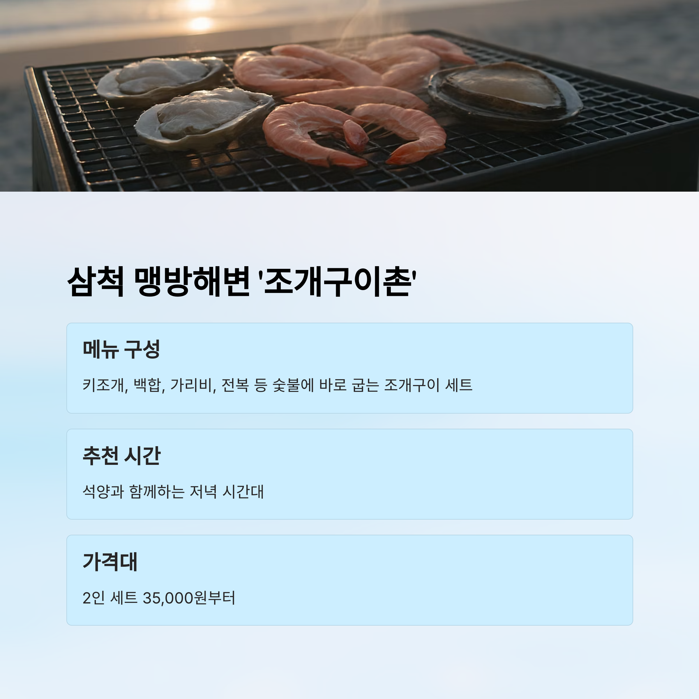 | DAY 2 저녁 | 삼척 맹방해변 | 조개구이 세트 |