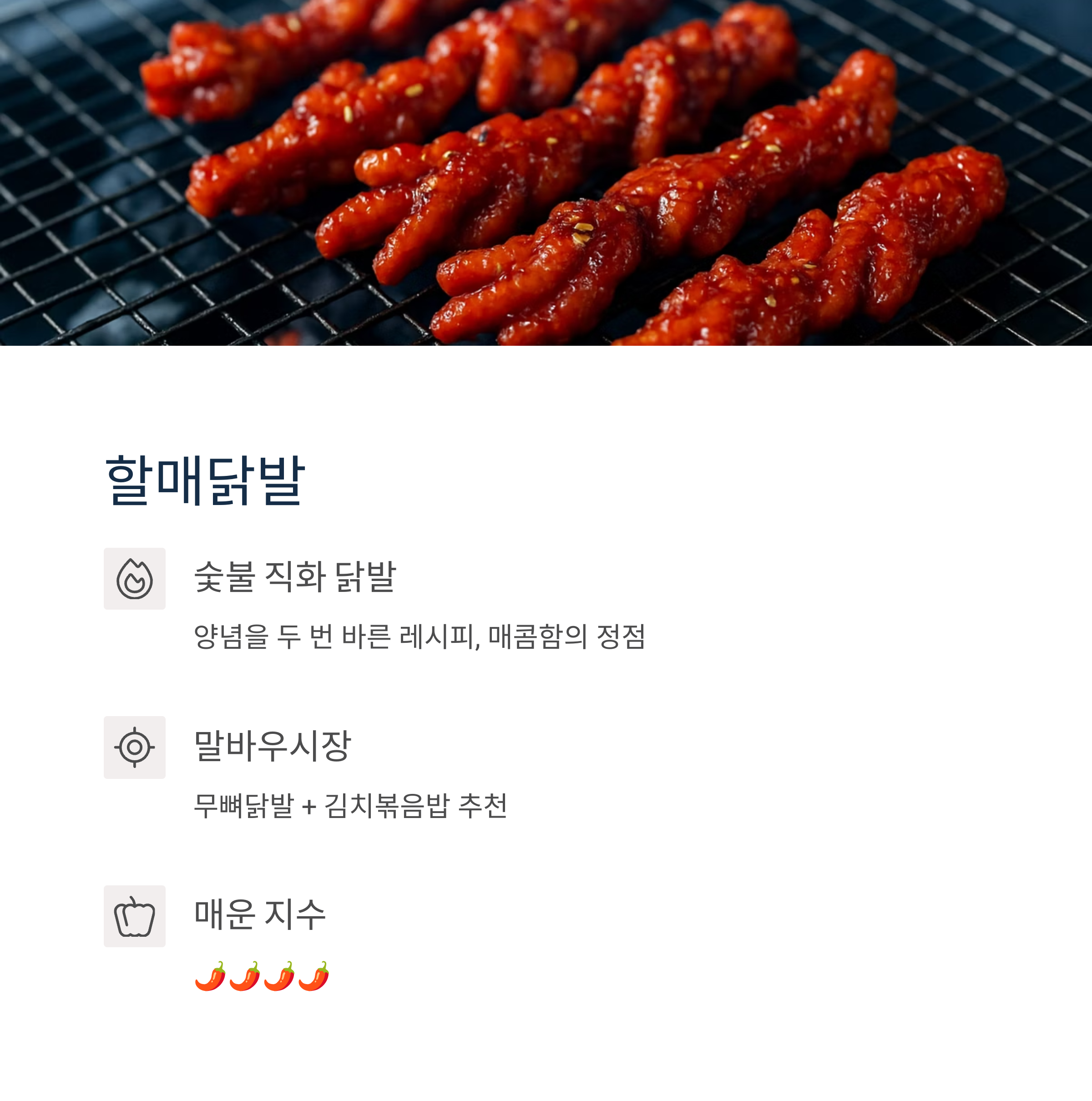 Step 4 – 야식: 말바우시장 할매닭발 (소주 한 잔)