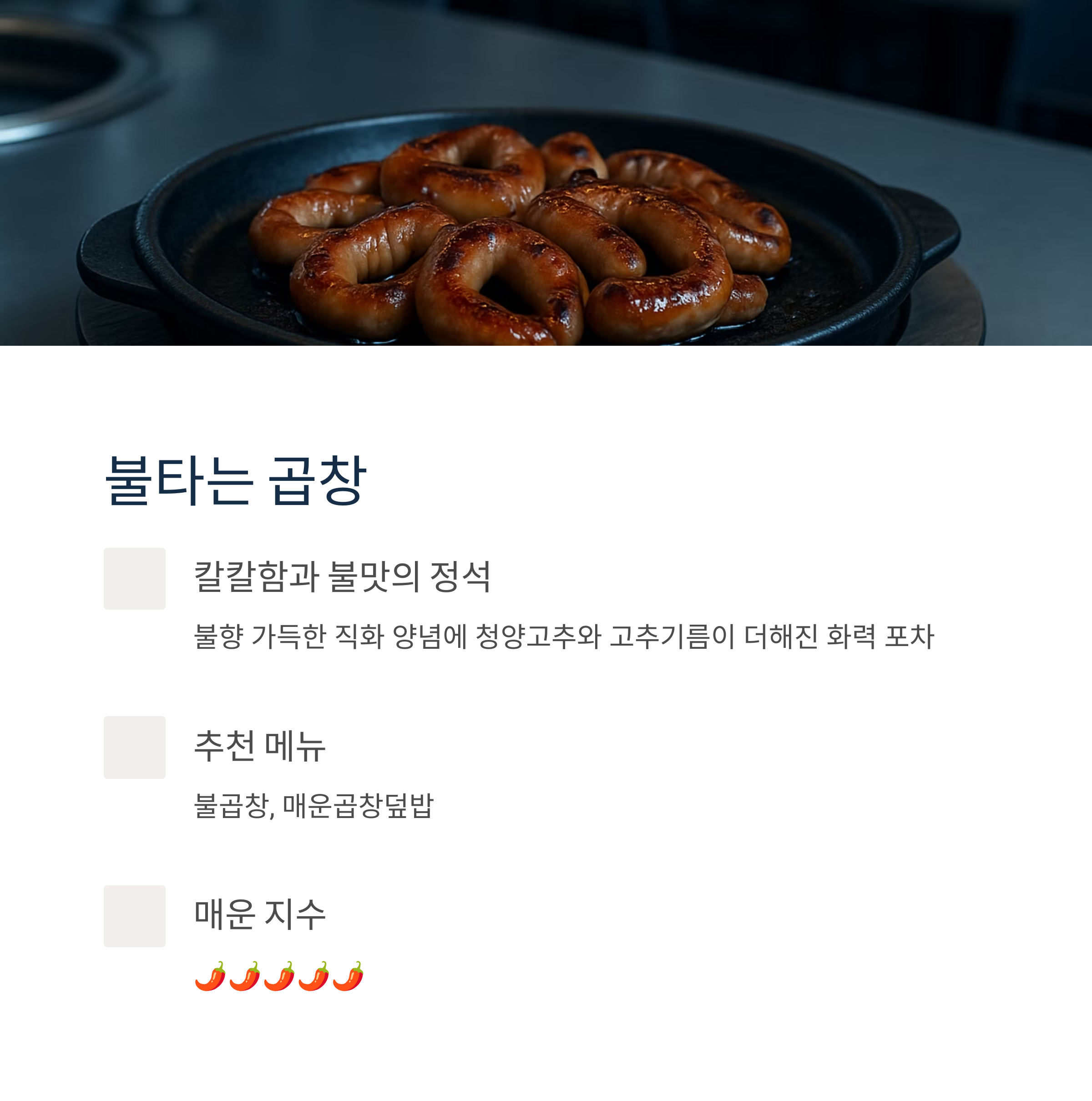 - 추천 메뉴: 불곱창, 매운곱창덮밥