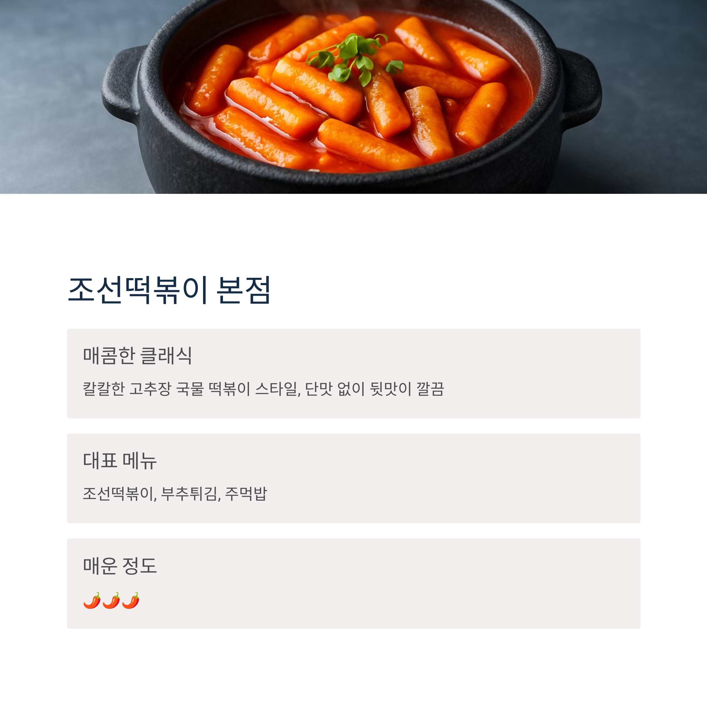 | 대표 메뉴 | 조선떡볶이, 부추튀김, 주먹밥 |