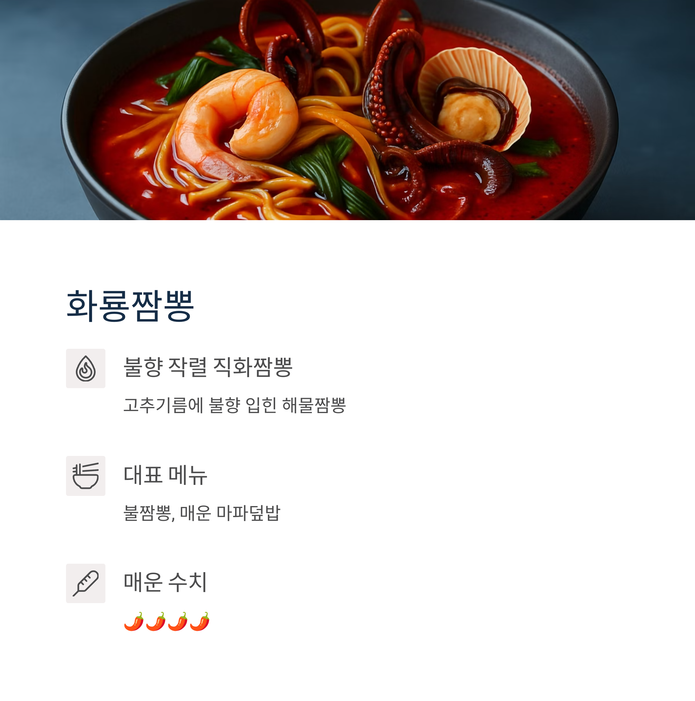| 대표 메뉴 | 불짬뽕, 매운 마파덮밥 |
