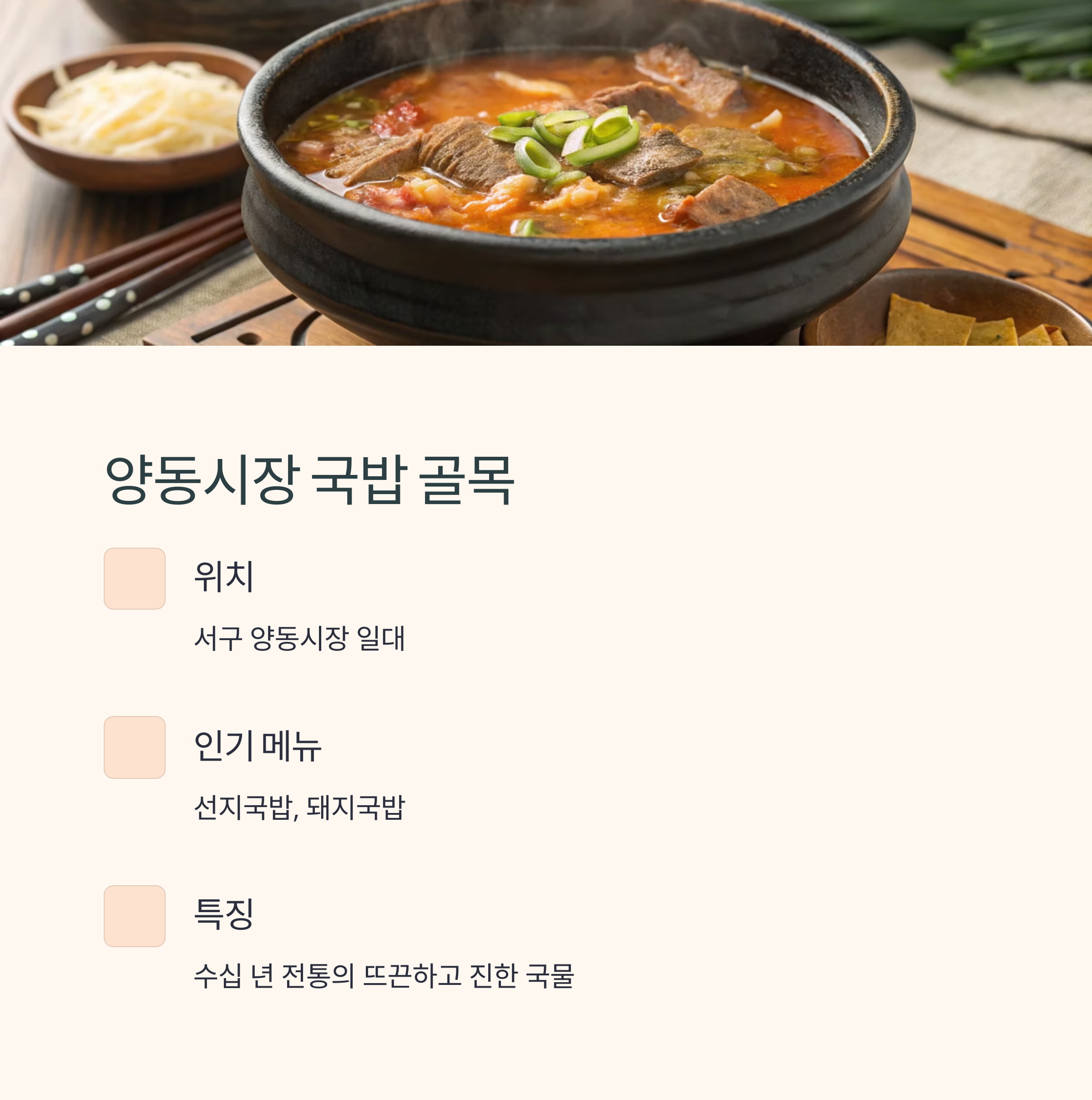 "양동시장 골목은 국밥 천국이라고 불릴 정도로 다양한 국밥 맛집이 모여 있습니다."