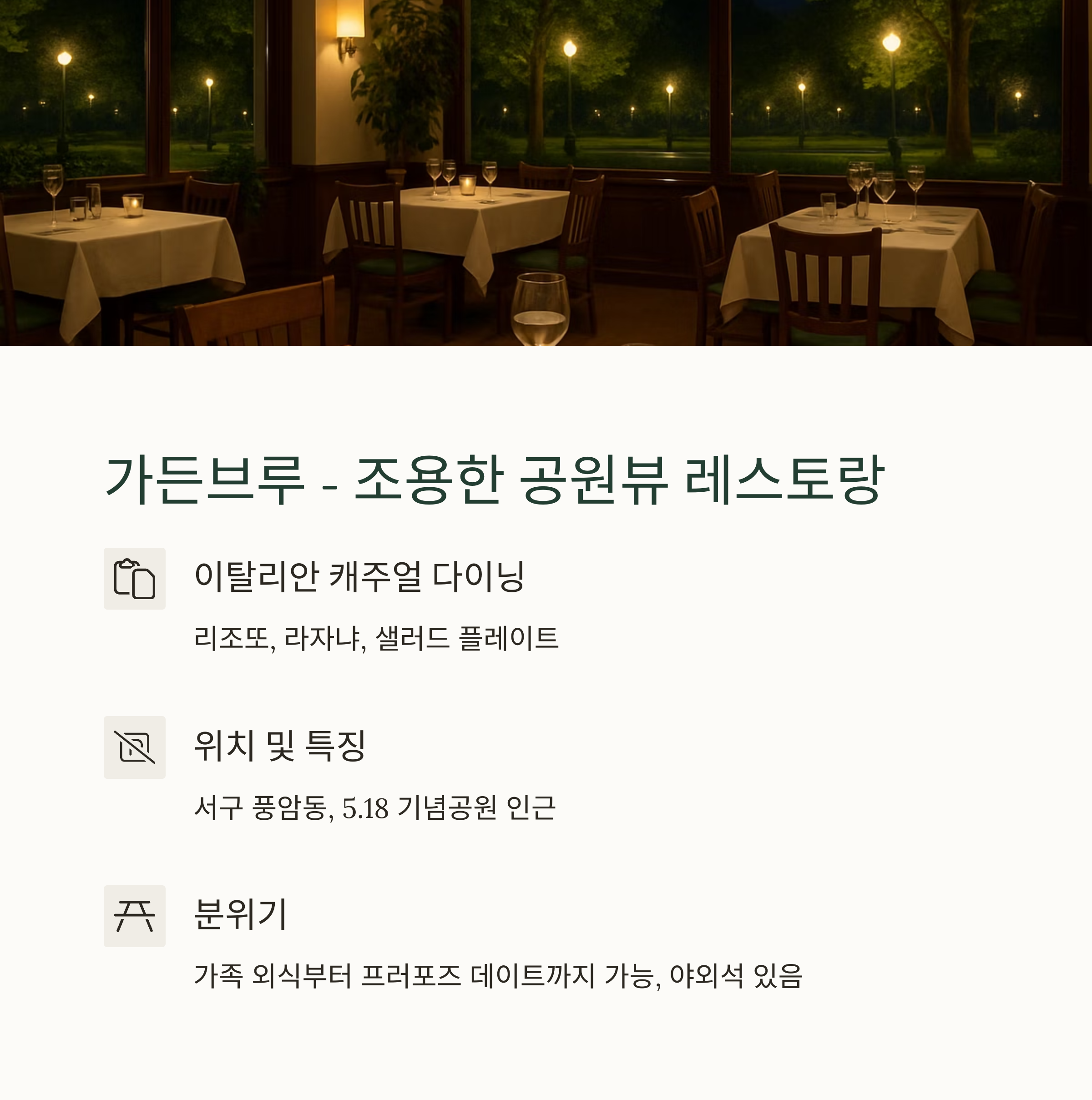 5. 5.18 기념공원 인근 ‘가든브루’ – 조용한 공원뷰 레스토랑