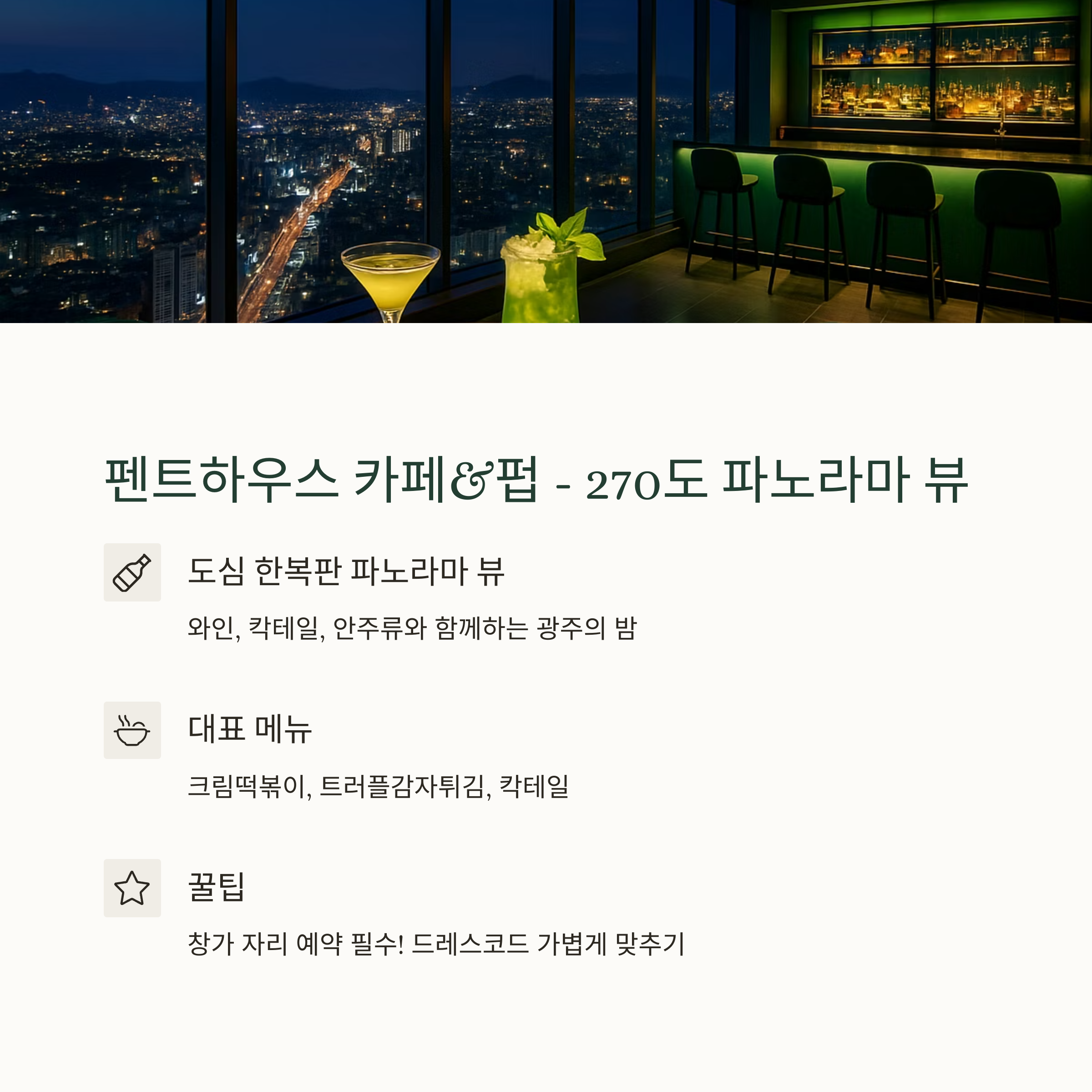 3. 상무지구 ‘펜트하우스 카페&펍’ – 광주 도심 야경 270도 파노라마
