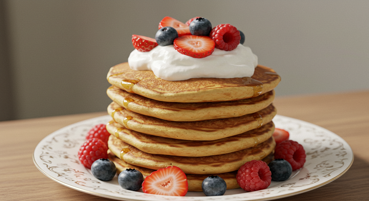 - 따뜻하게 데운 팬케이크나 와플을 접시에 올립니다.
