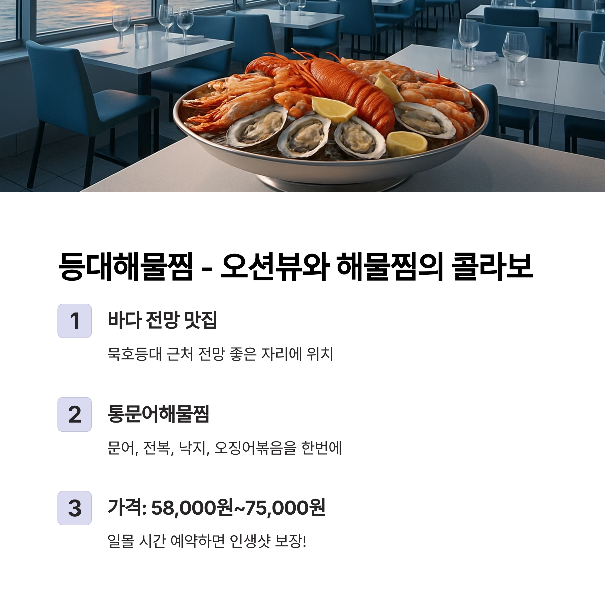 | 등대해물찜 | 오션뷰 + 매콤찜 | 58,000~75,000원 | 바다 보며 식사, 인생샷 가능 |