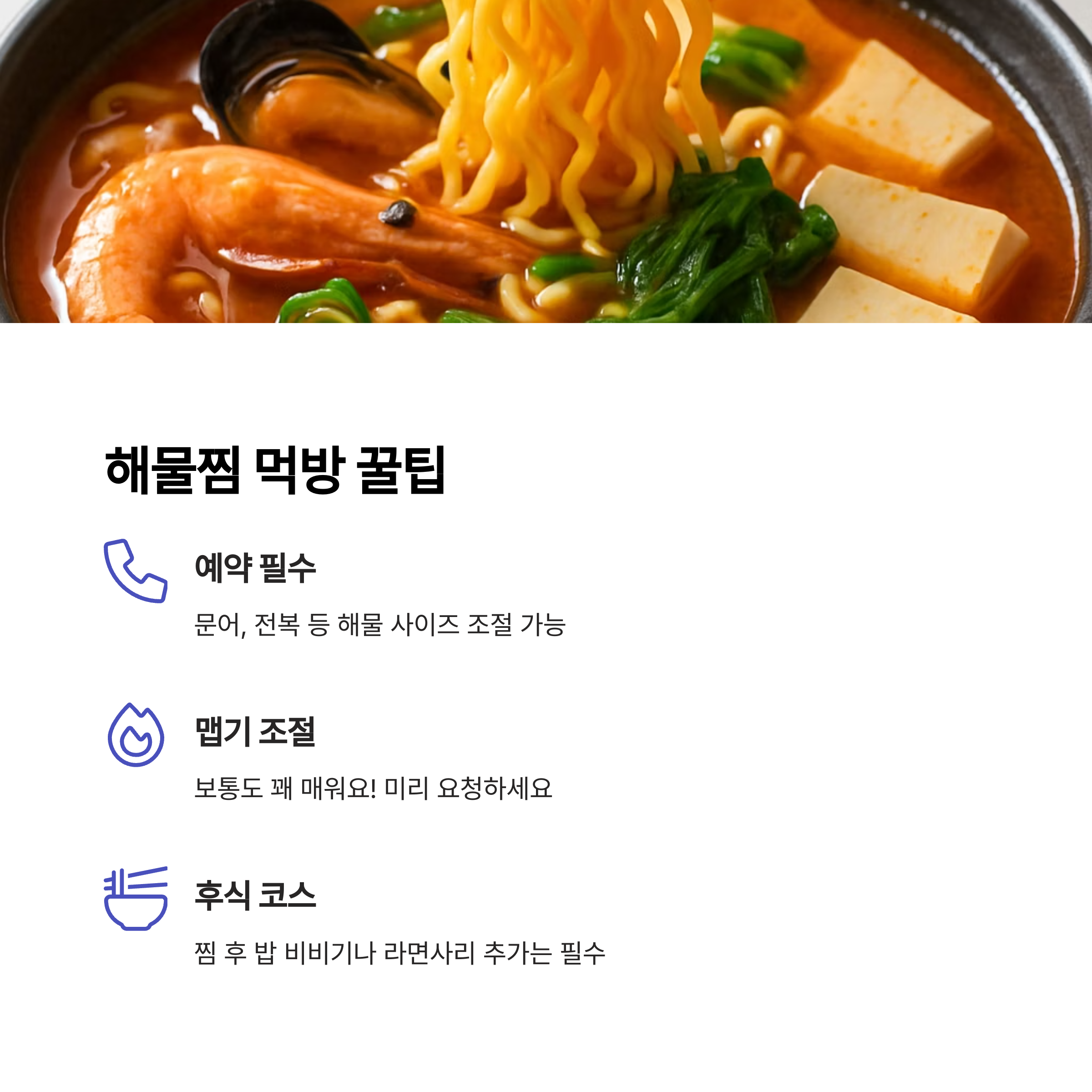 - 추천 메뉴: 통문어해물찜 (매운맛 선택 가능)