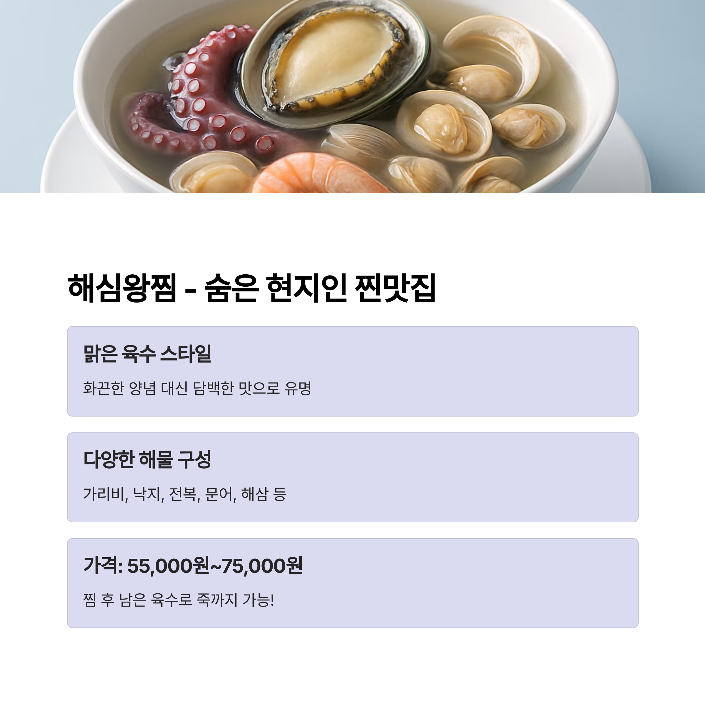| 해심왕찜 | 담백 국물찜 | 55,000~75,000원 | 자극 없는 국물맛, 죽 추가 |