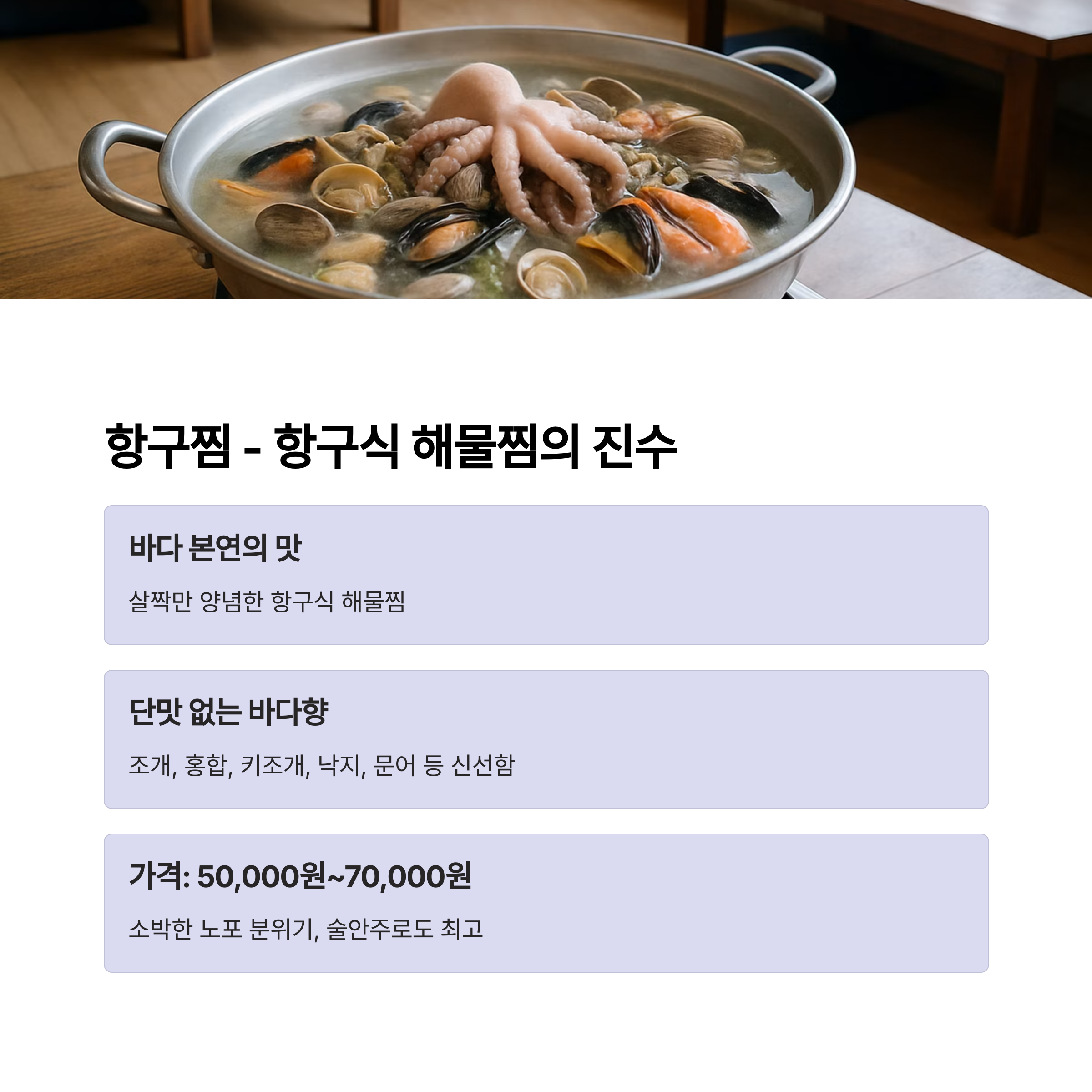 | 항구찜 | 항구식 소금찜 | 50,000~70,000원 | 자연 해물맛 중심, 술안주용 |