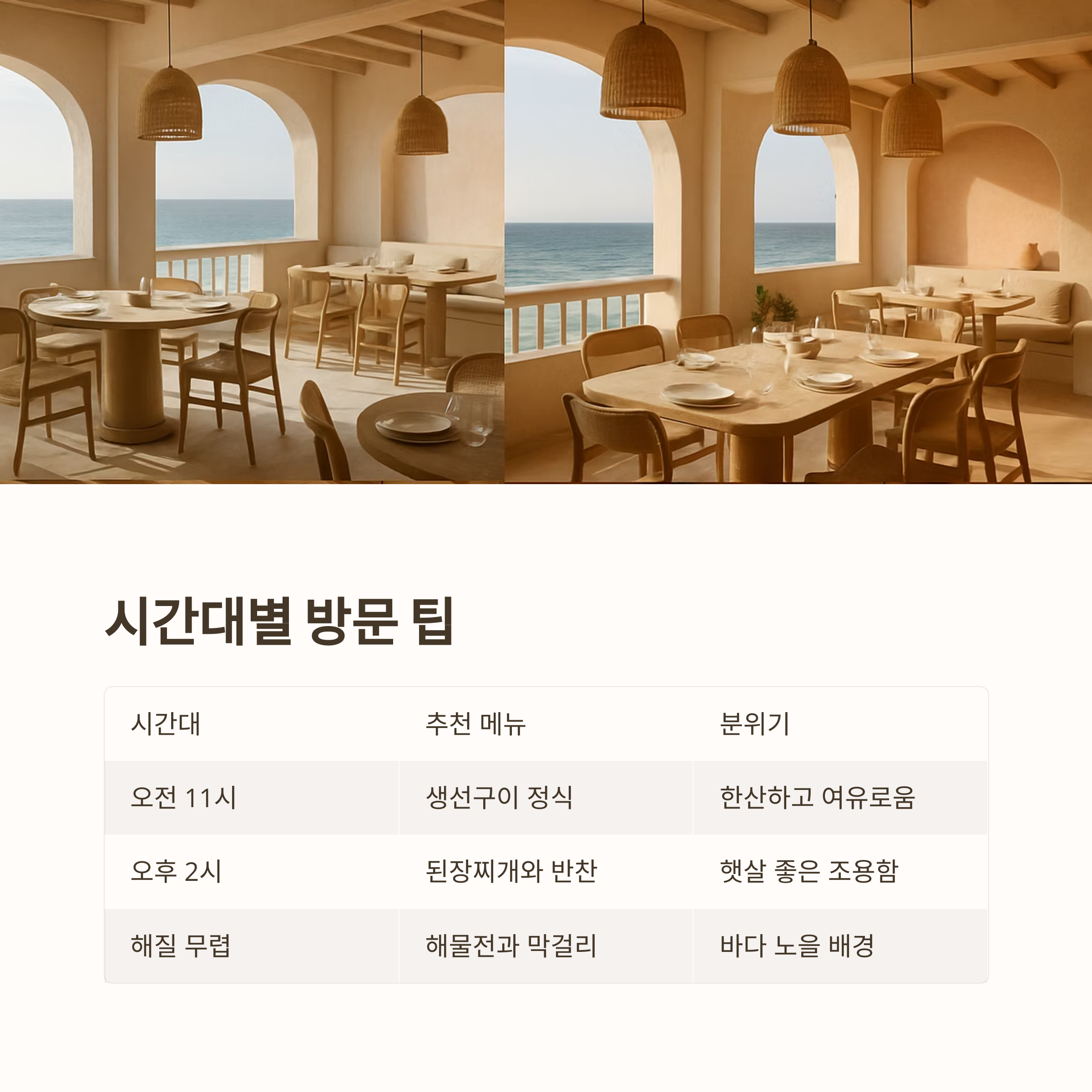 | 해질 무렵 | 해물전과 막걸리 | 바다 노을 배경 | 여유롭고 분위기 있는 식사 가능 |