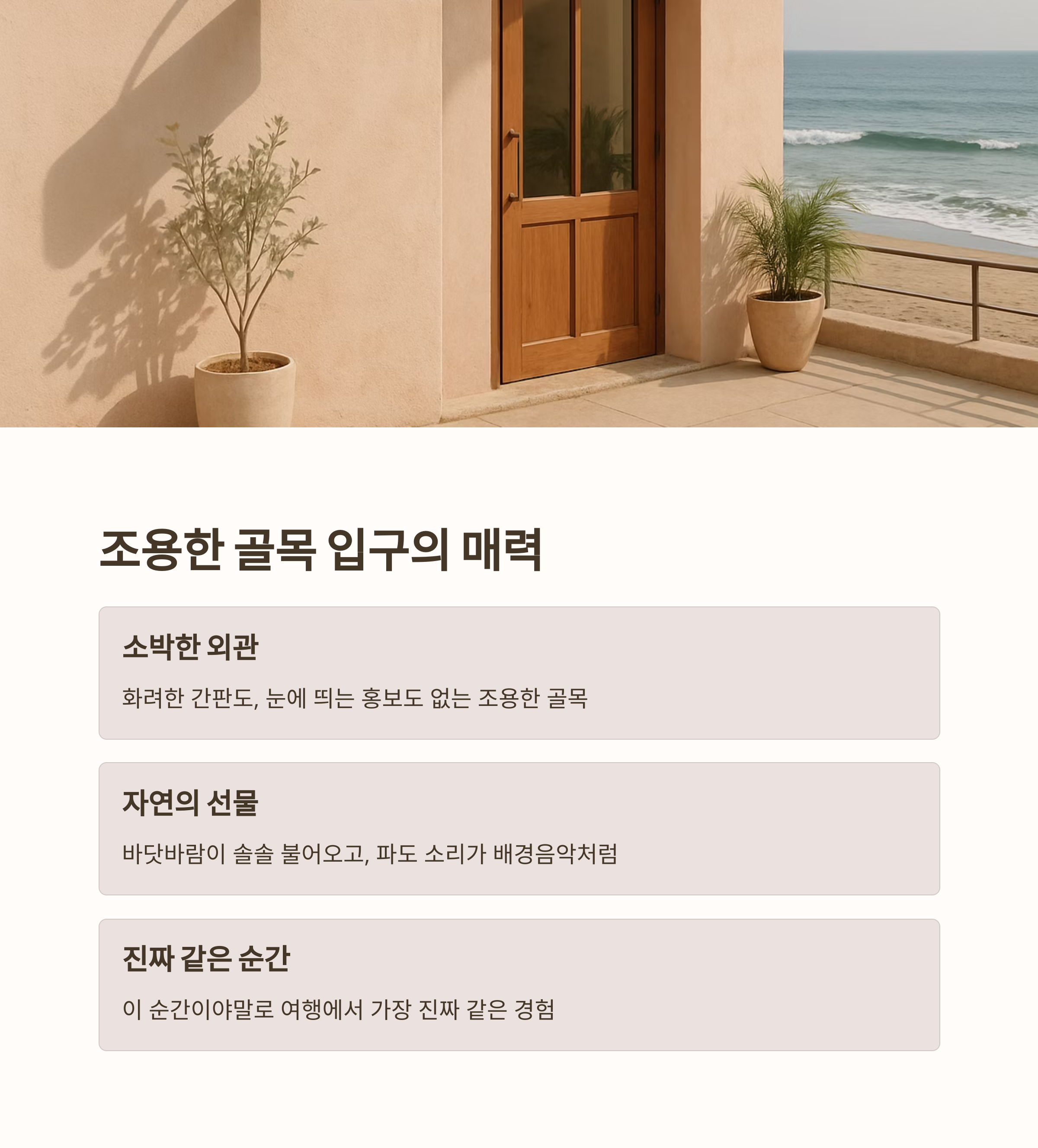 파도 소리와 바람, 그리고 조용한 골목 입구