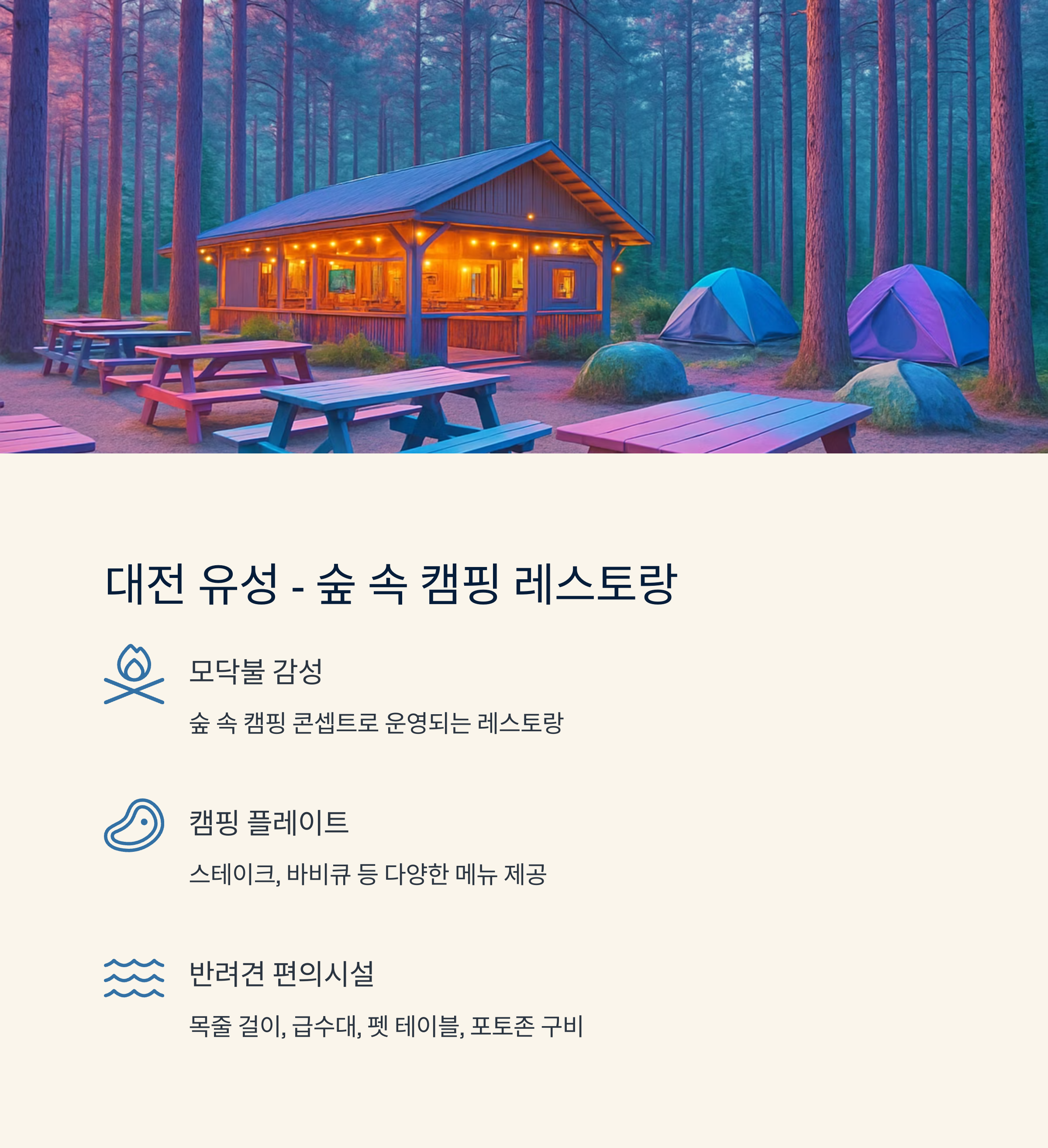 대전 유성에는 숲 속 캠핑 콘셉트로 운영되는 레스토랑이 있습니다.