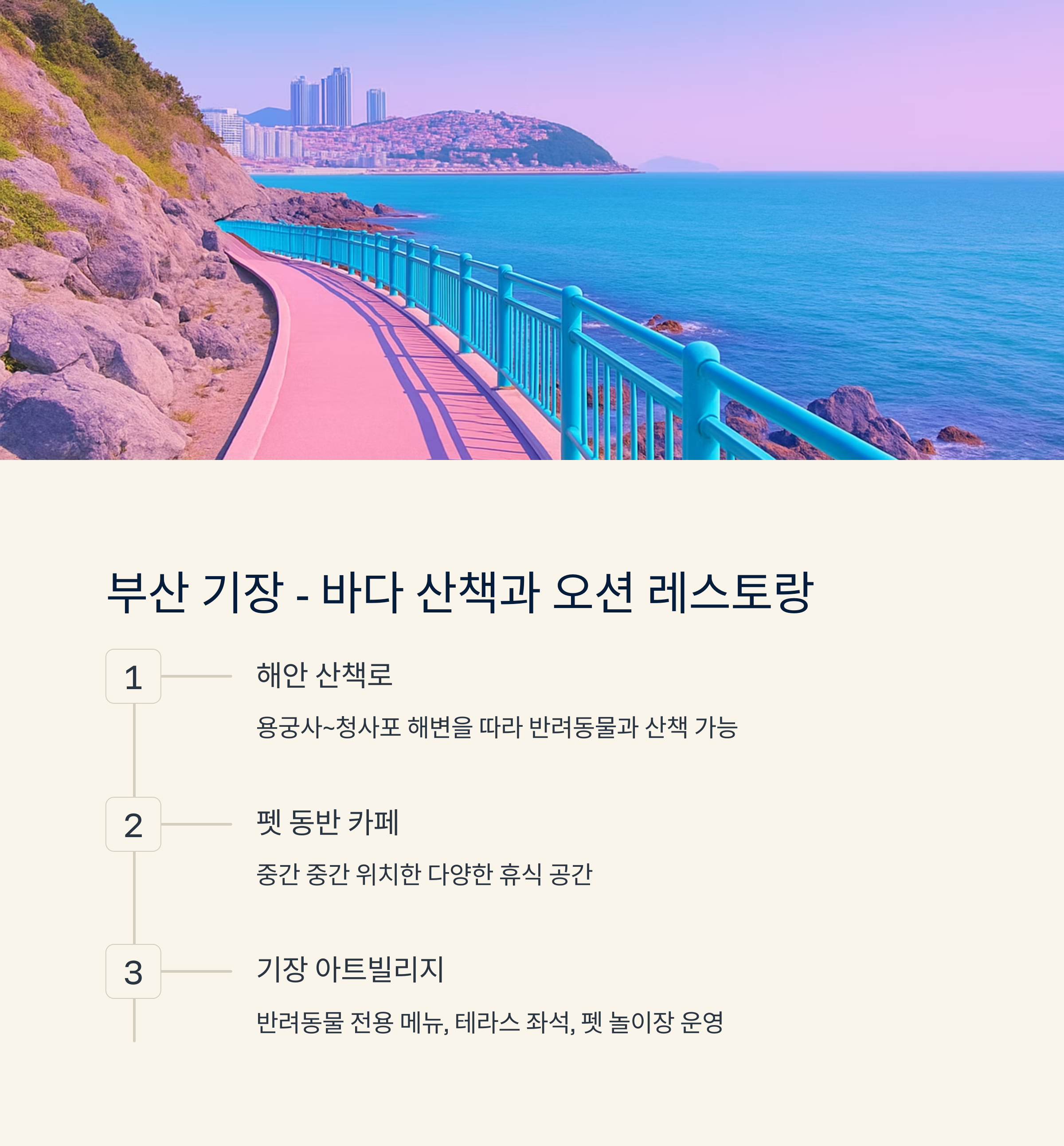 부산 기장은 해안 산책로와 함께 펫 동반 가능한 오션 레스토랑이 많아 드라이브 코스로 인기가 높습니다.