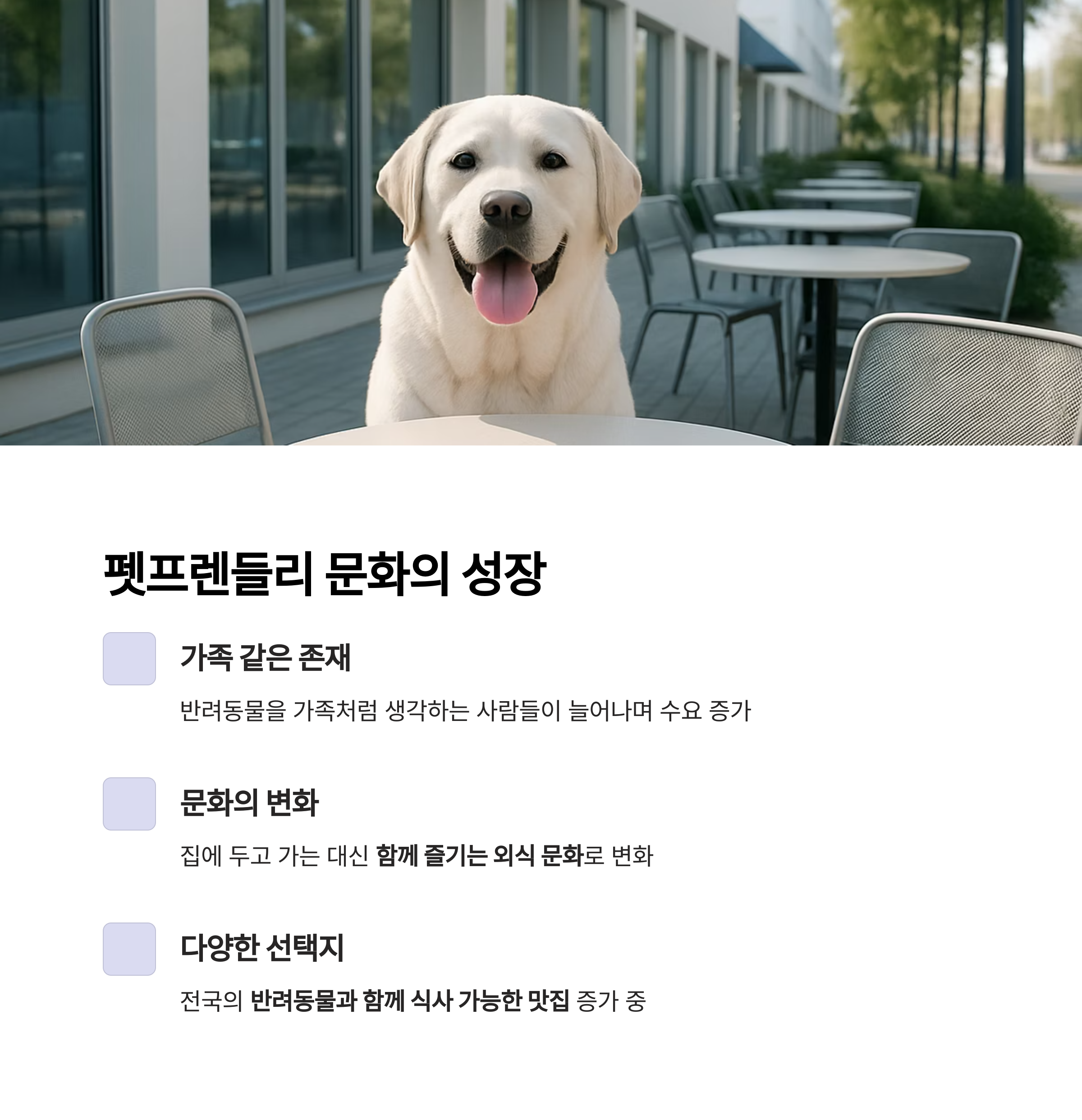 예전에는 외식을 할 때 반려동물을 집에 두고 나가야 했지만, 이제는 함께 즐기는 외식 문화로 점차 변화하고 있습니다.