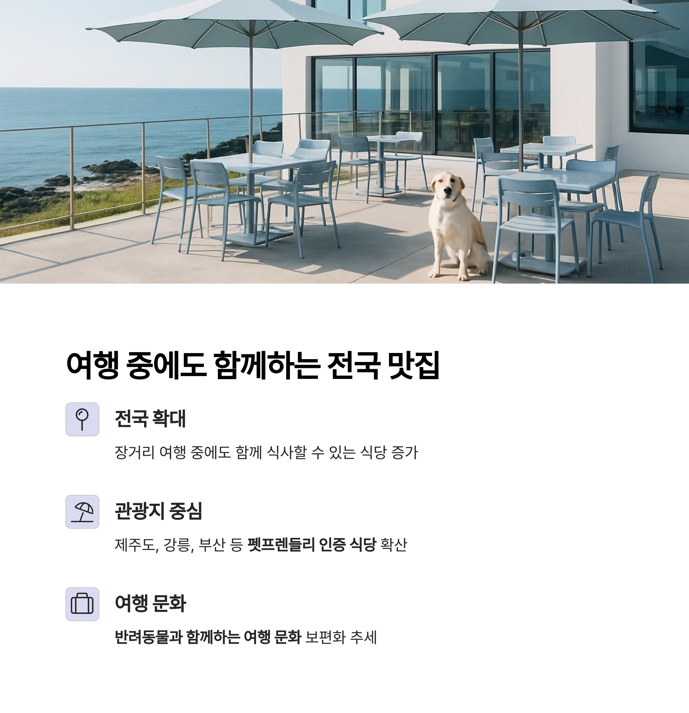 제주도, 강릉, 부산 등 관광지 중심으로 펫프렌들리 인증 식당과 카페가 생겨나고 있습니다.