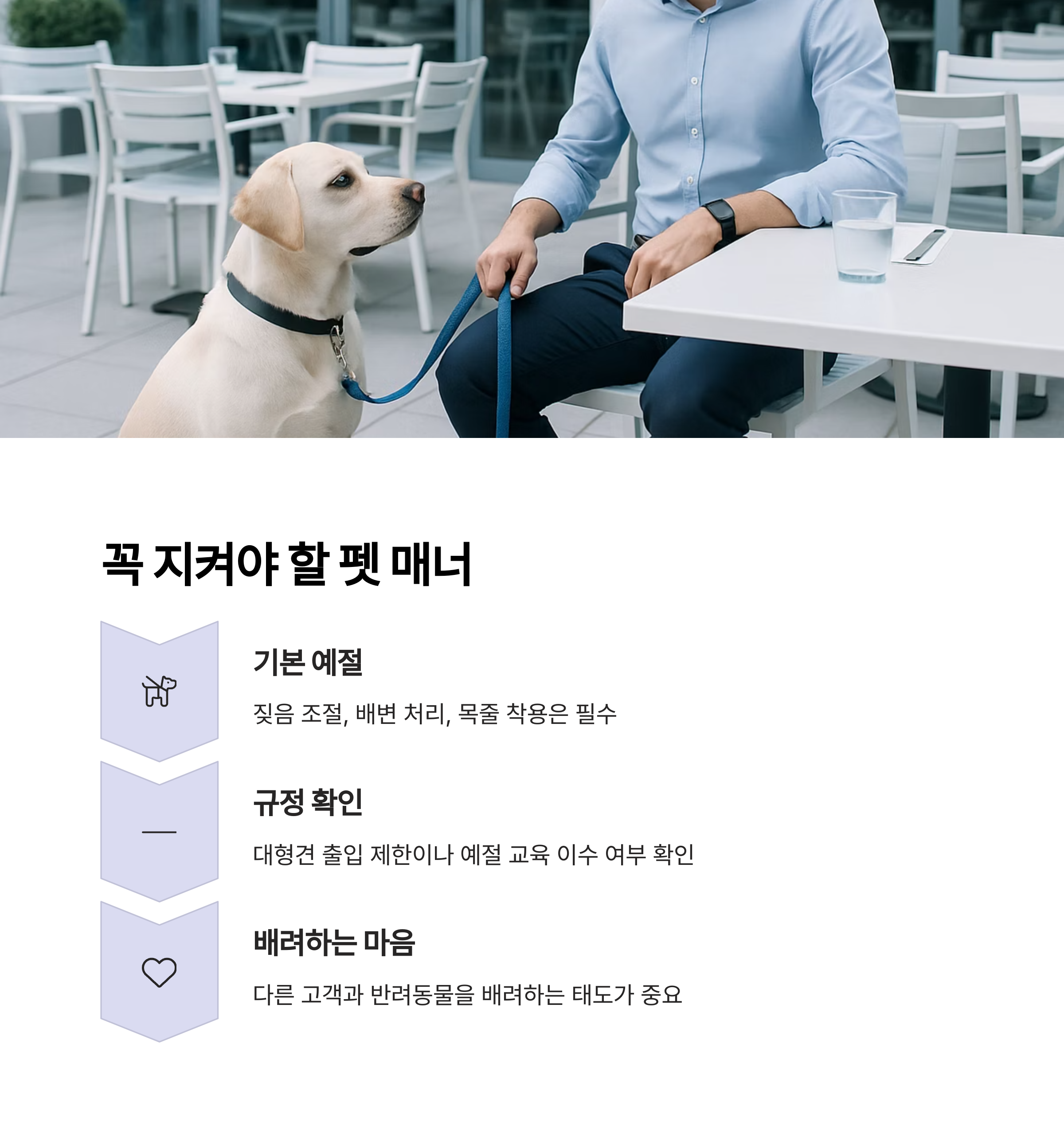 모든 펫프렌들리 식당이 동일한 조건을 갖춘 건 아닙니다. 아래 사항을 사전 확인하세요.