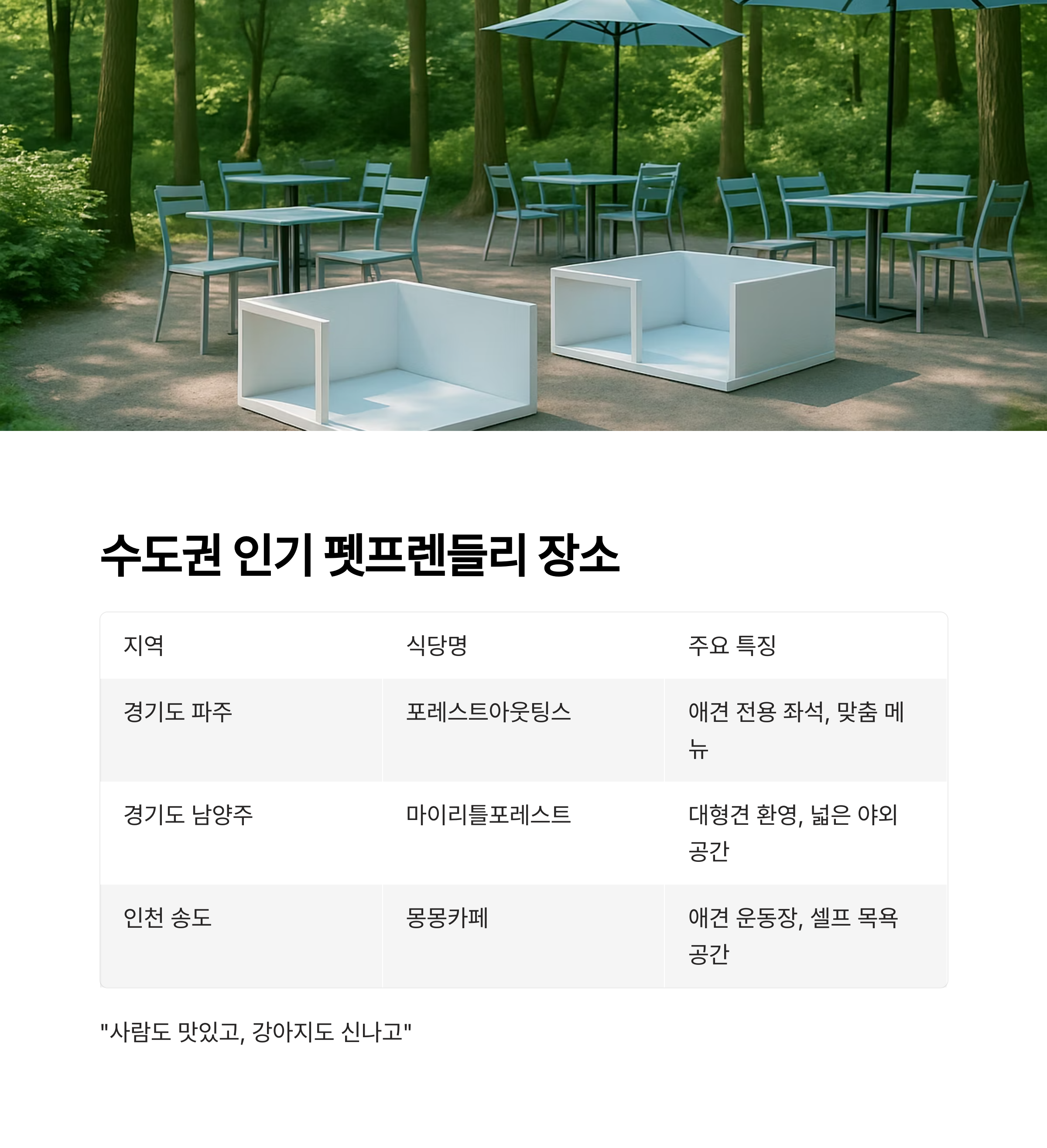 | 경기도 파주 | 포레스트아웃팅스 | 애견 전용 좌석, 반려견 맞춤 메뉴 제공 |