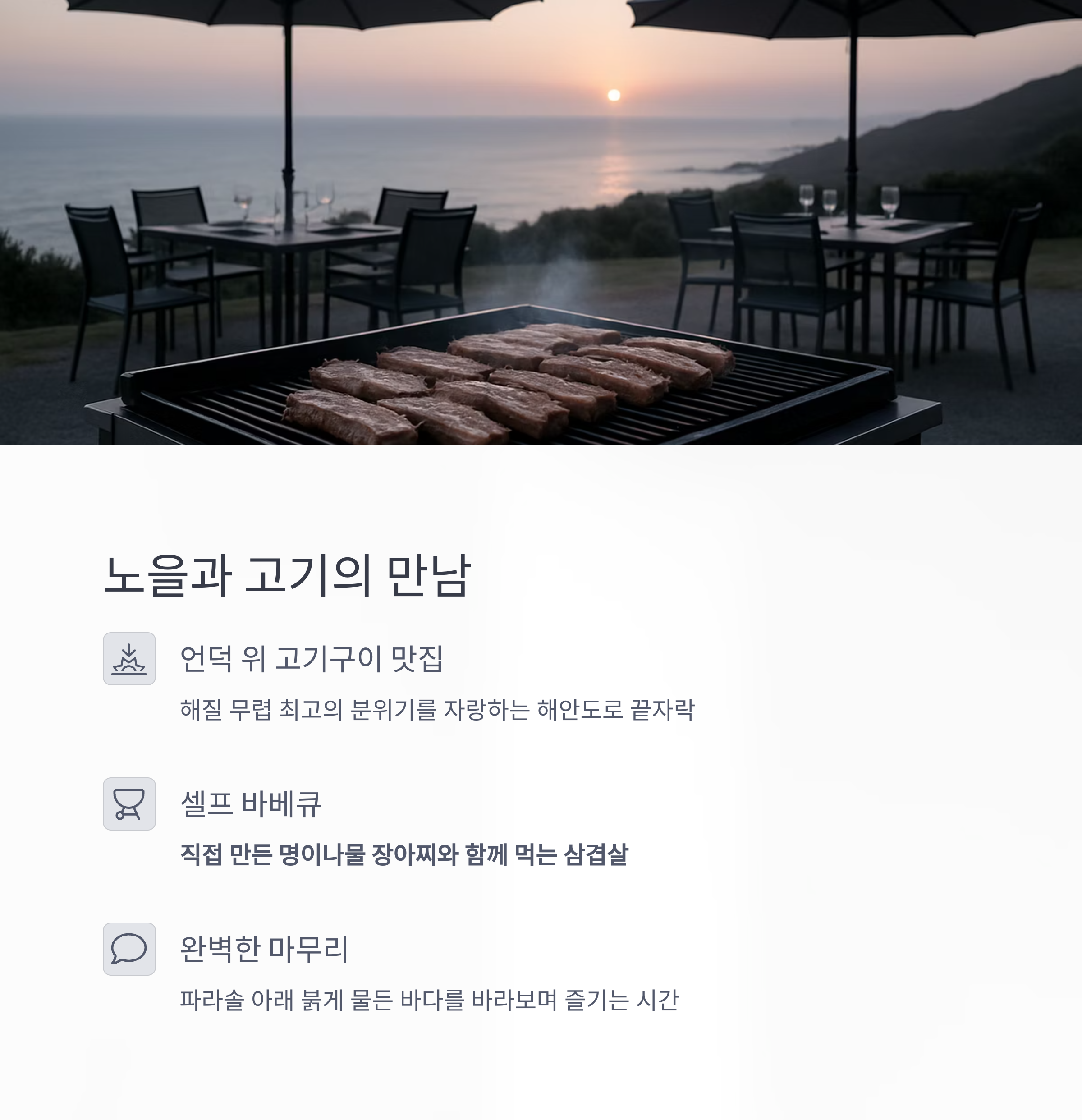 | 해안도로 끝자락 언덕 | 삼겹살 바비큐 | 해넘이 전망, 셀프 구이, 명이나물과 완벽한 궁합 |