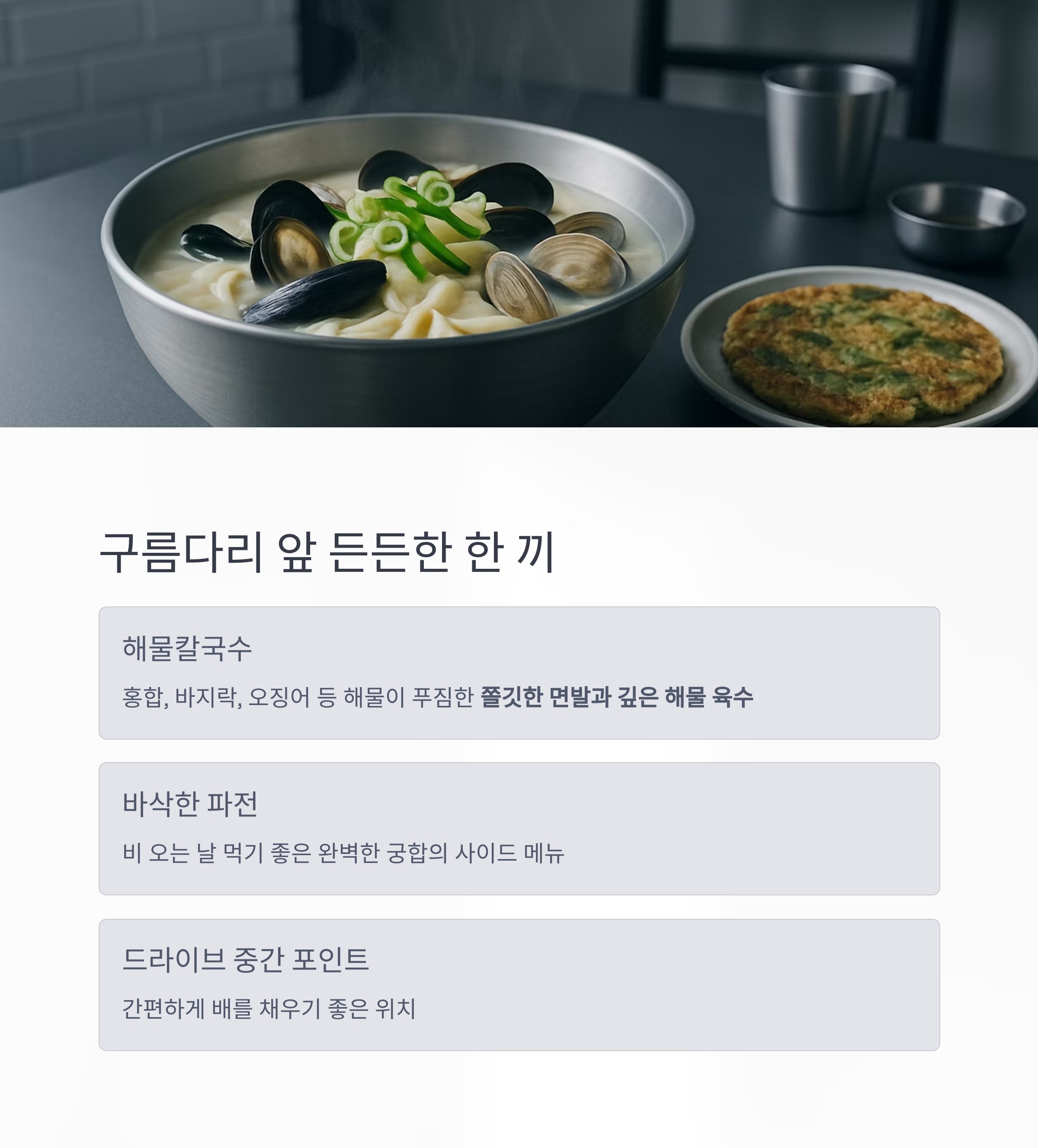 | 백수 구름다리 앞 | 해물칼국수+파전 세트 | 진한 해물 육수, 쫄깃한 면발, 비 오는 날 제격 |