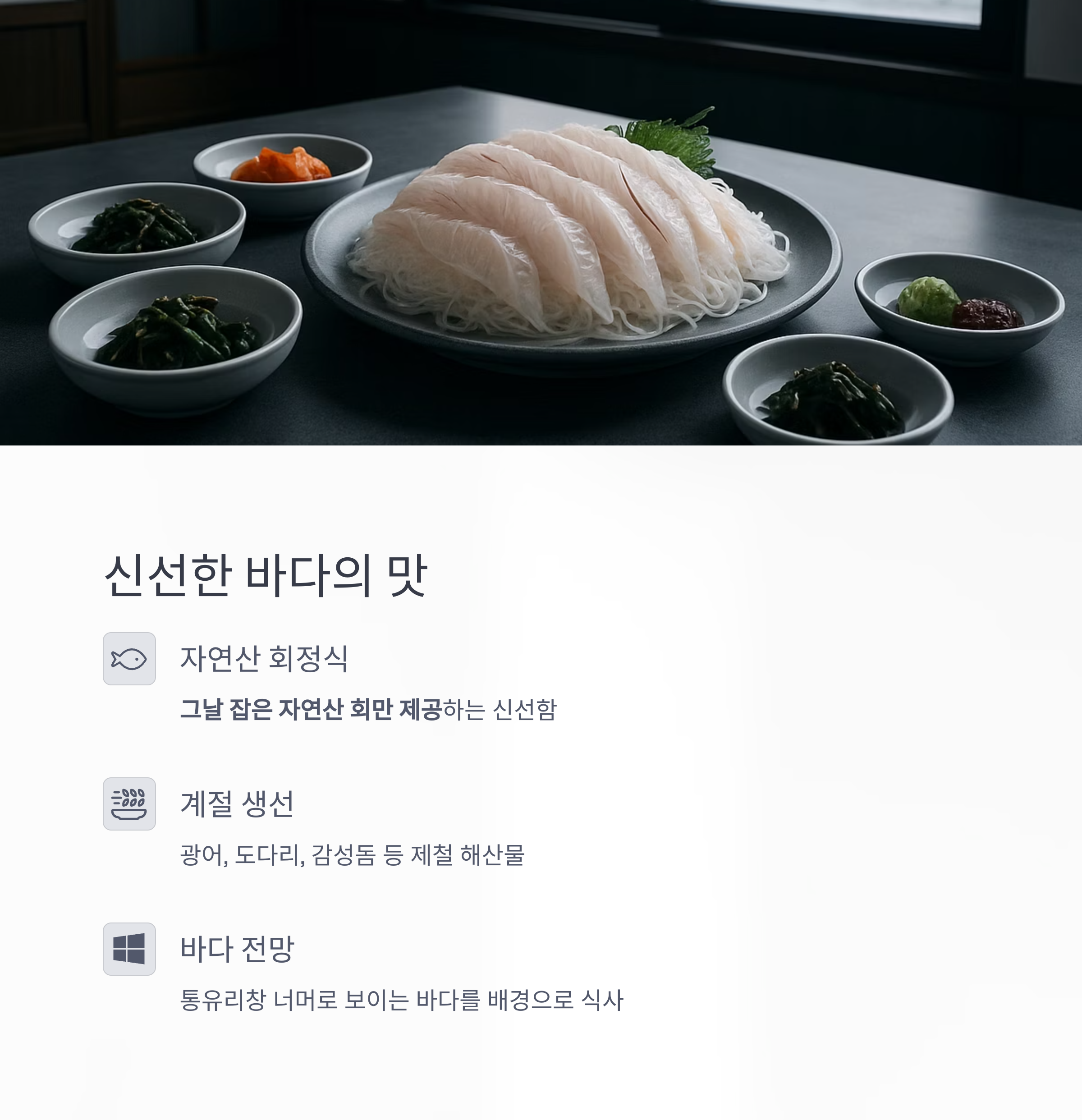 | 해안 뷰 중간 구간 | 자연산 회정식 | 신선한 회, 통유리 바다 전망, 현지 단골 많은 식당 |