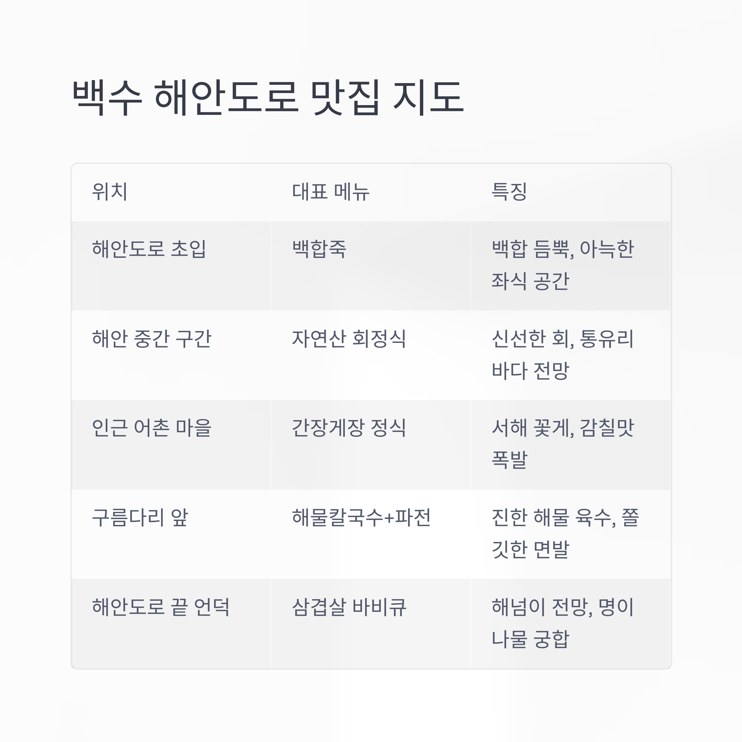 백수 해안도로 숨은 맛집 요약 표