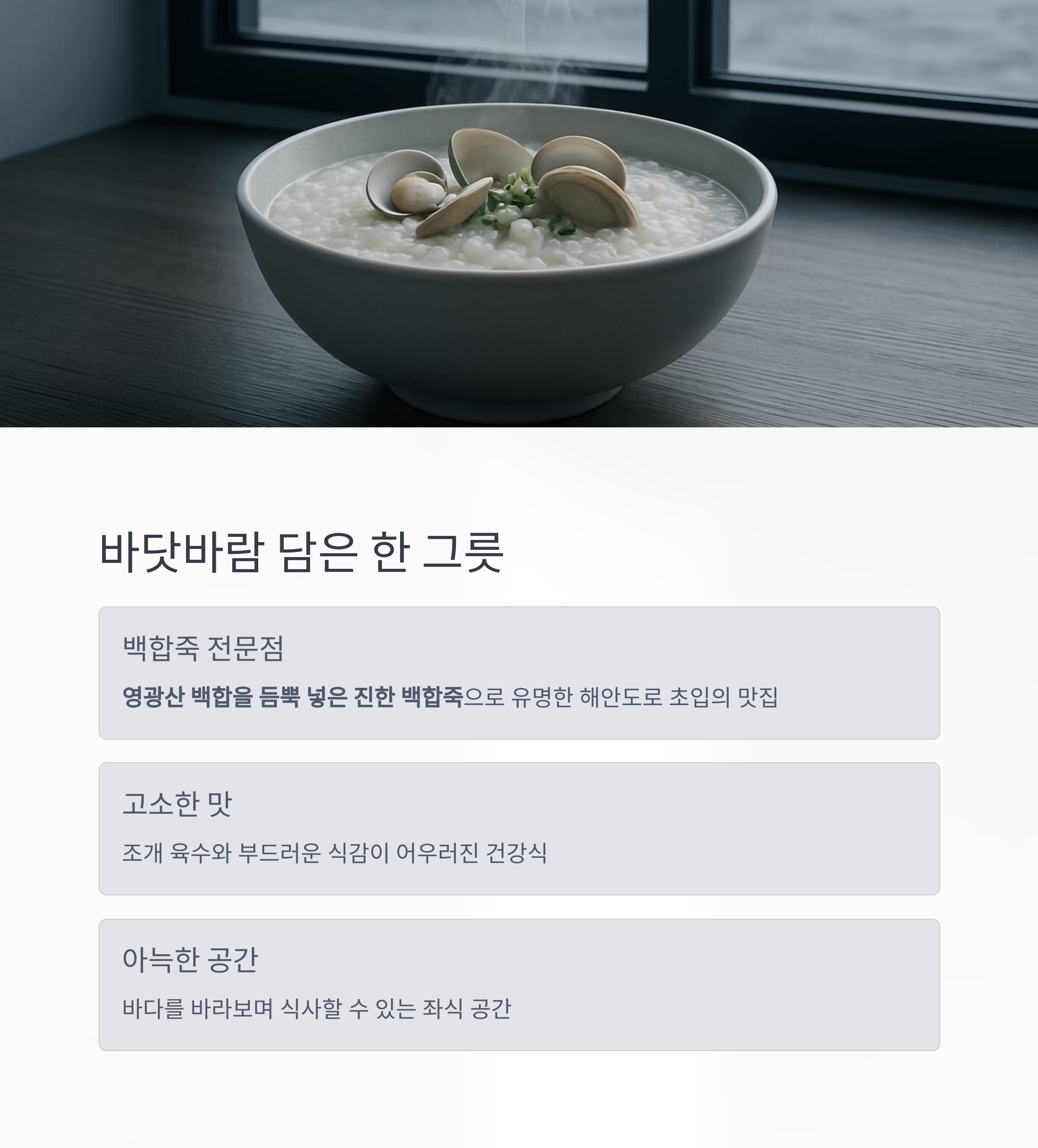 | 해안도로 초입 | 백합죽 | 백합 듬뿍, 아늑한 좌식 공간, 편안한 건강식 |