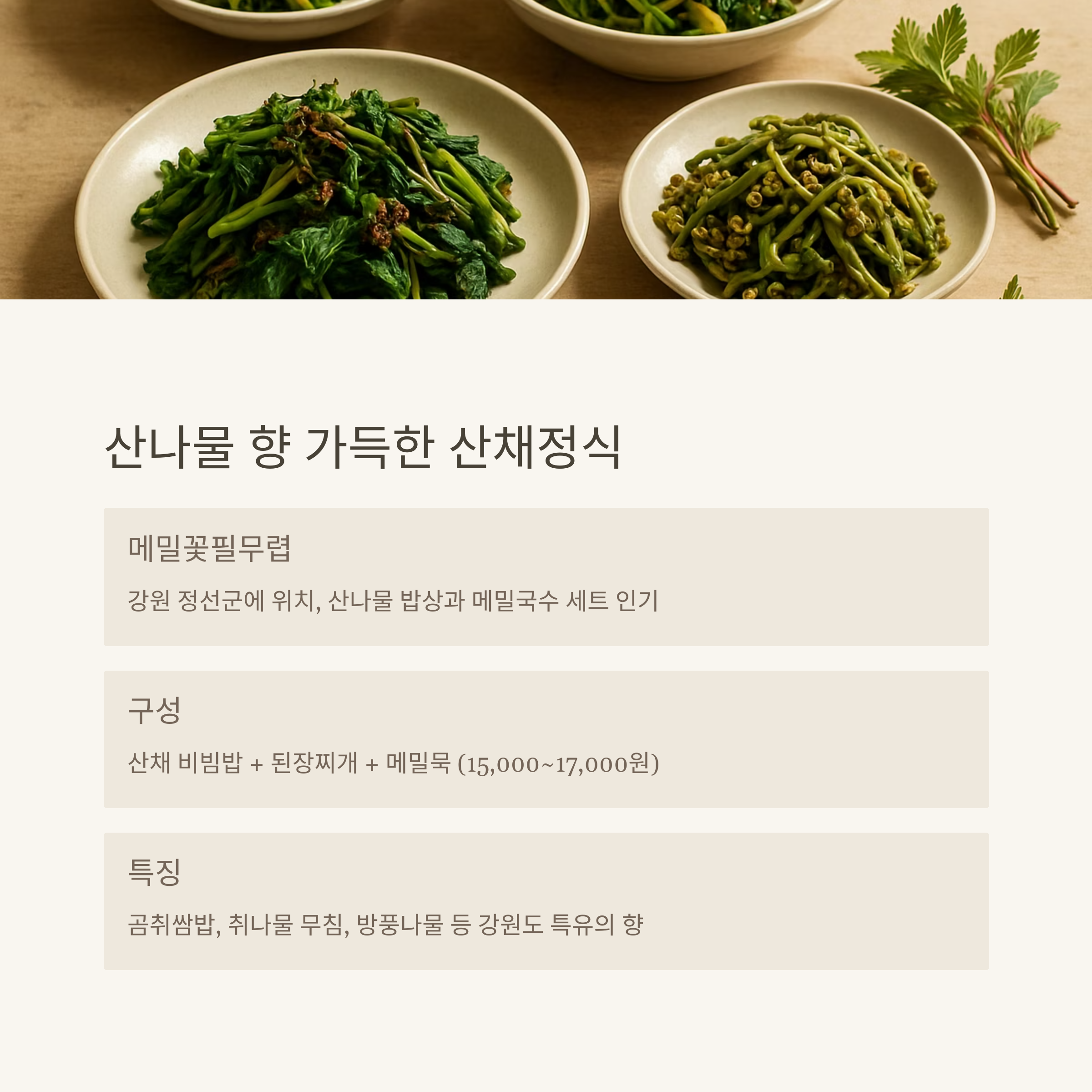 • 구성: 산채 비빔밥 + 된장찌개 + 메밀묵