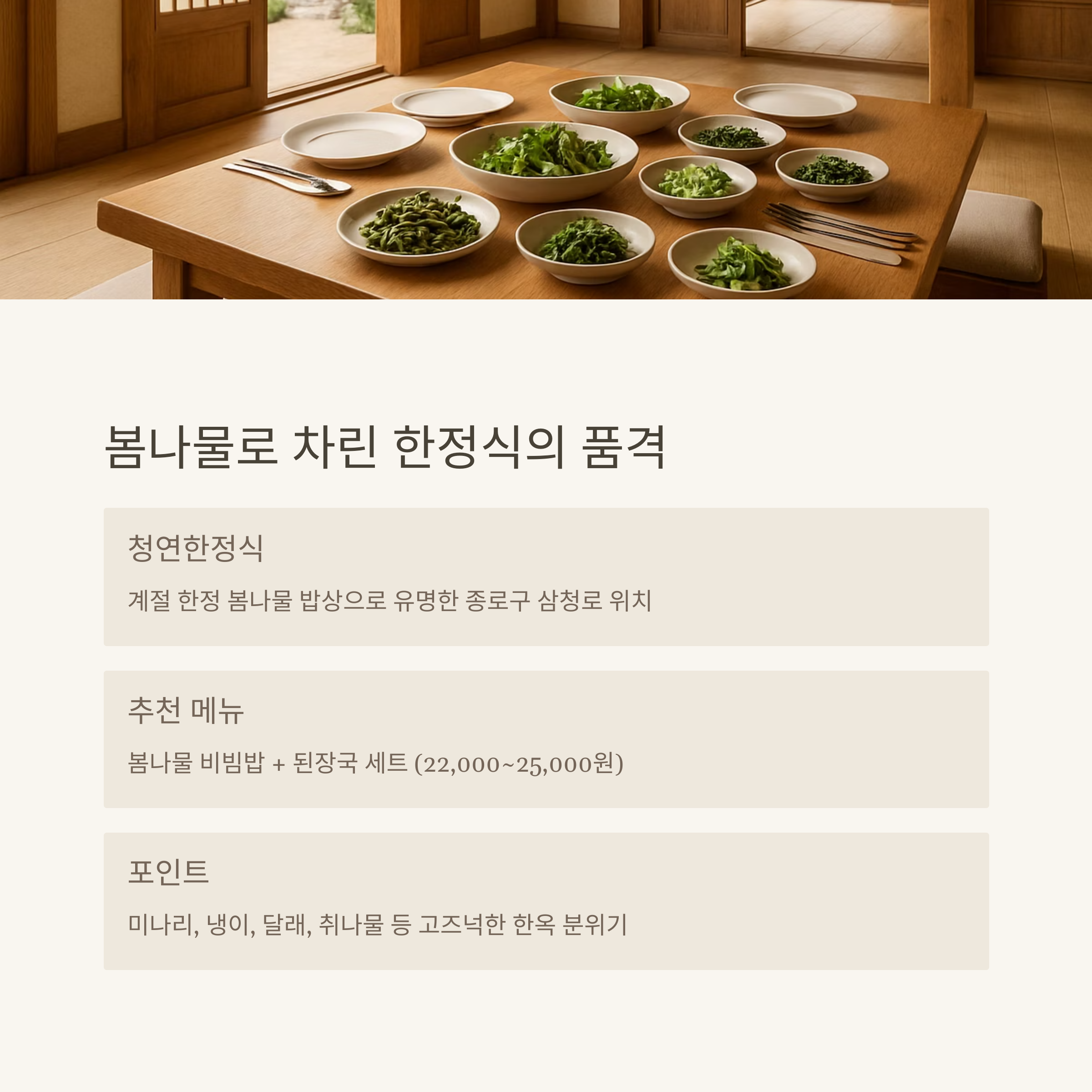 • 추천 메뉴: 봄나물 비빔밥 + 된장국 세트