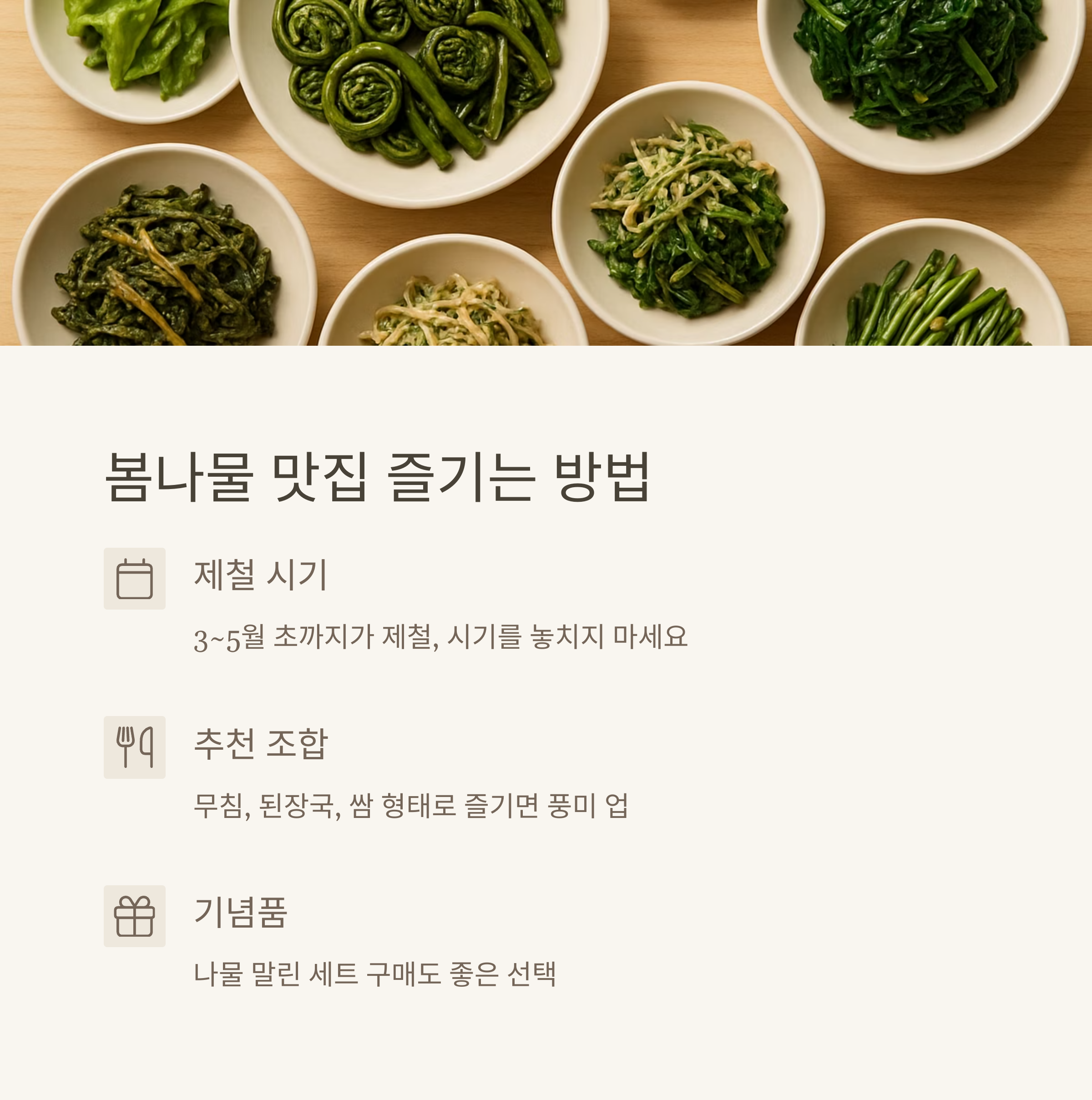 • 나물은 생으로 먹기보다 무침, 된장국, 쌈 형태로 즐기면 풍미 업