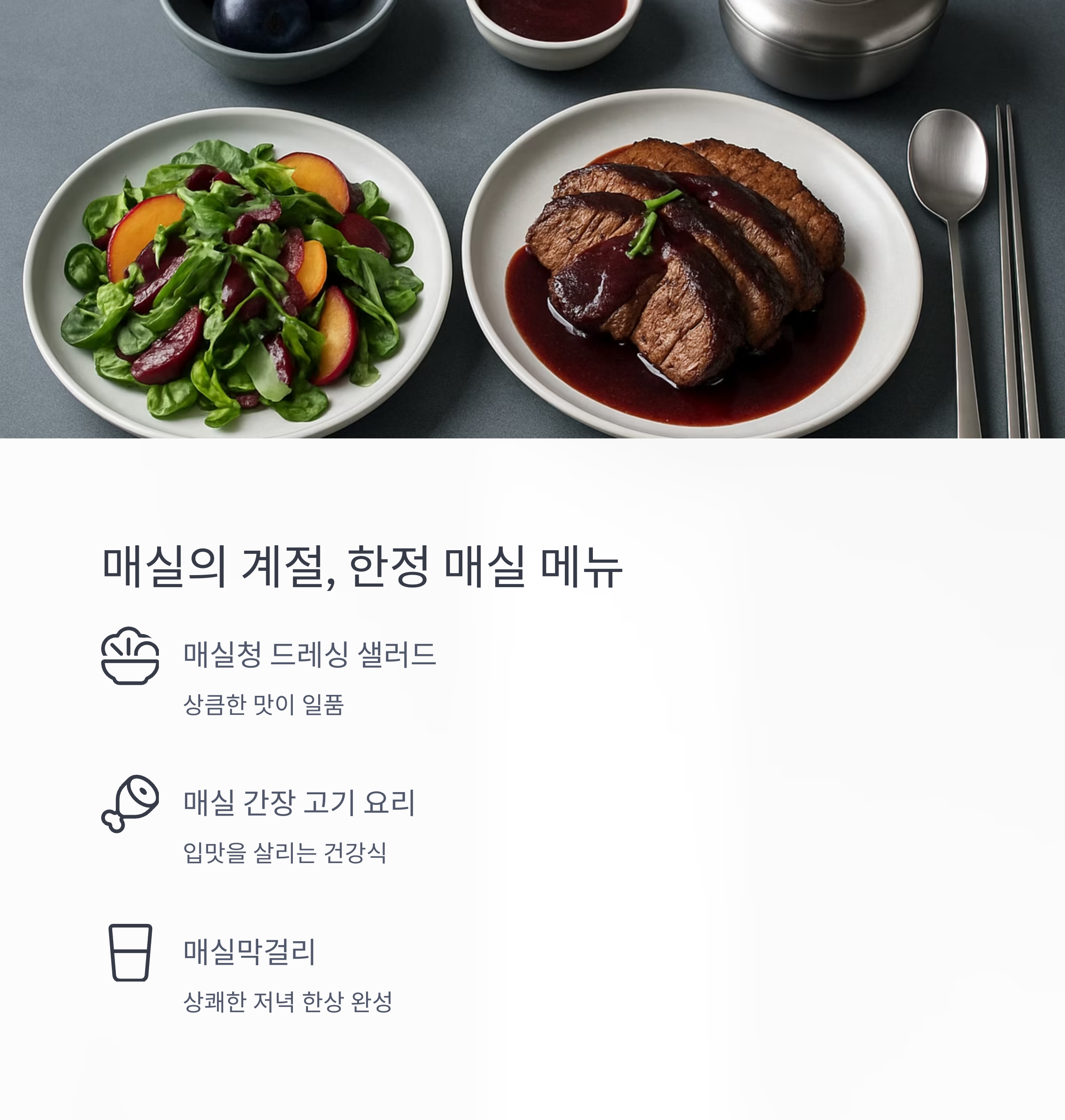 매실막걸리와 곁들이면 상쾌한 저녁 한상이 완성됩니다.