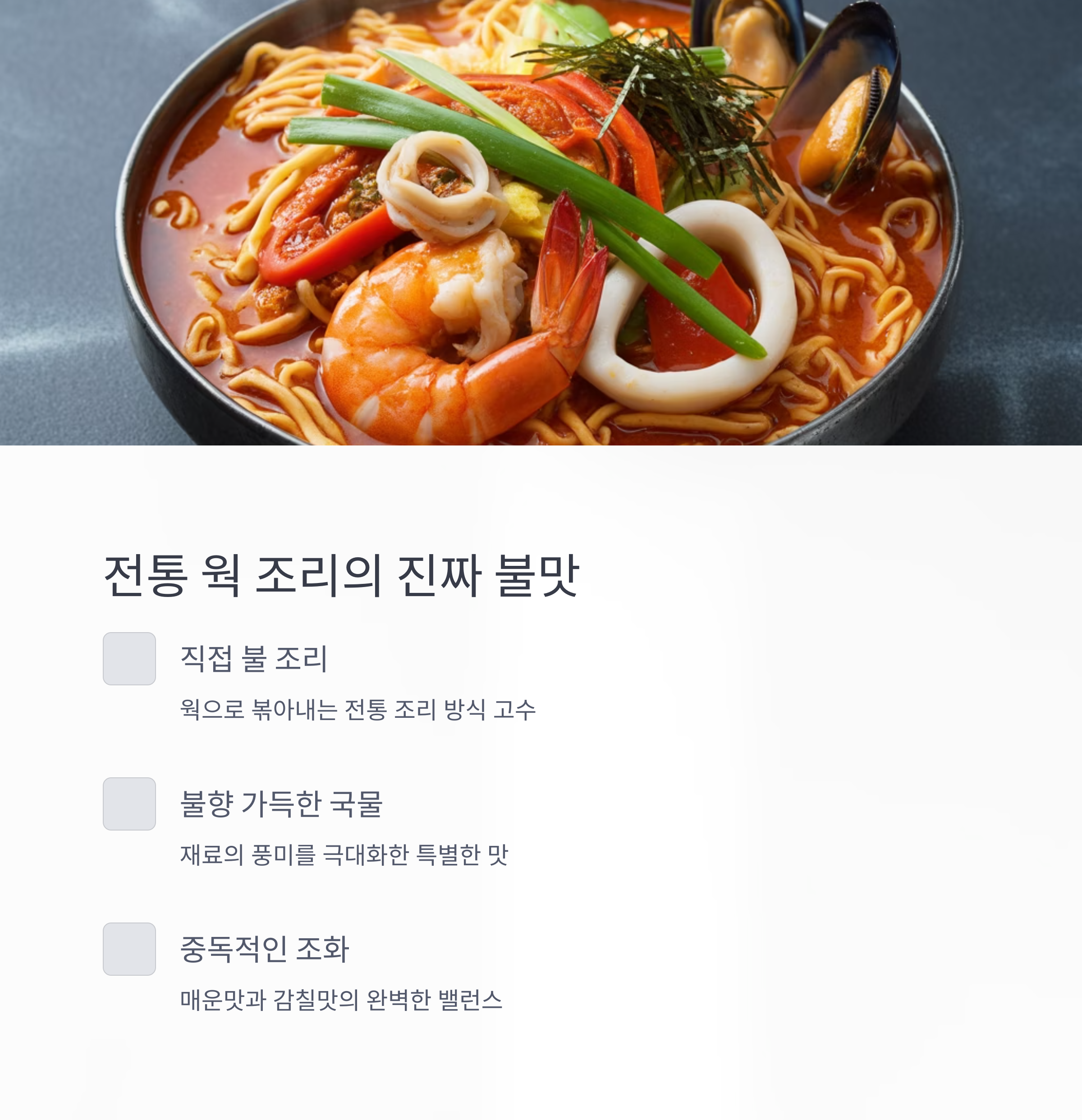 재료의 풍미를 극대화한 불향 가득한 국물이 특징입니다.