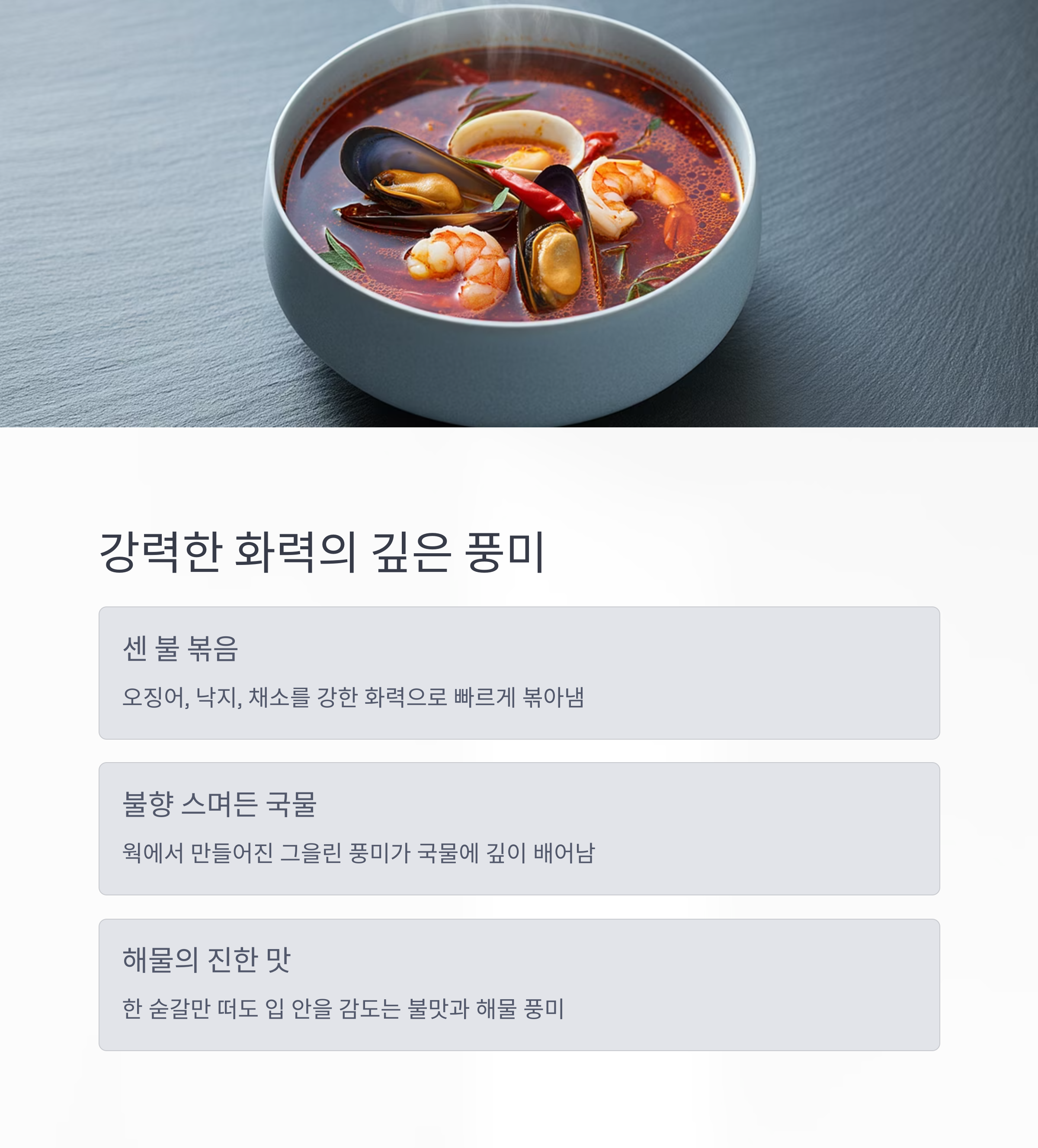 한 숟갈만 떠도 입 안을 감도는 불맛과 해물의 진한 풍미가 인상 깊게 다가옵니다.