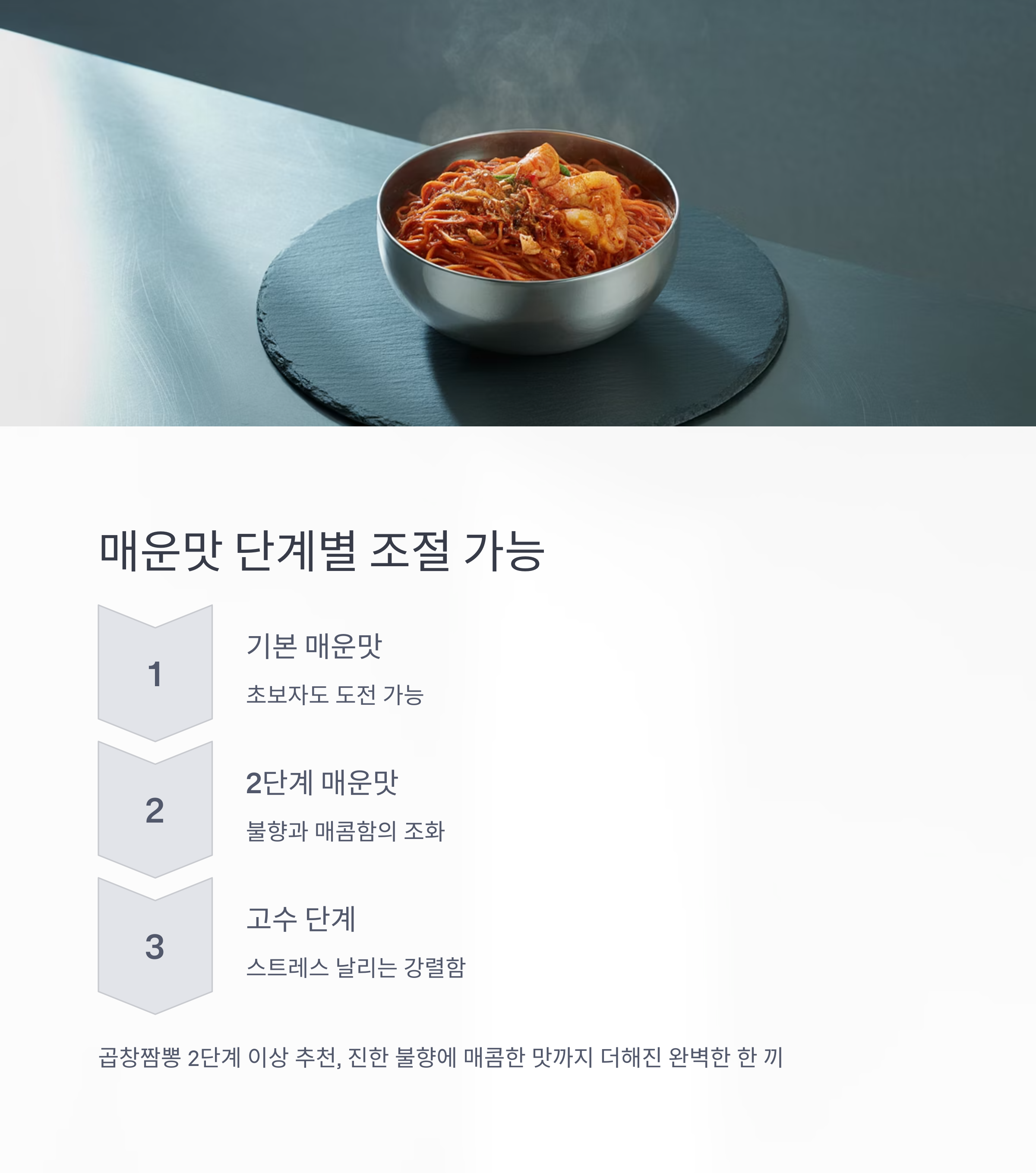 단계별로 매운맛 조절이 가능해 매운 음식 초보자부터 고수까지 모두 만족할 수 있습니다.