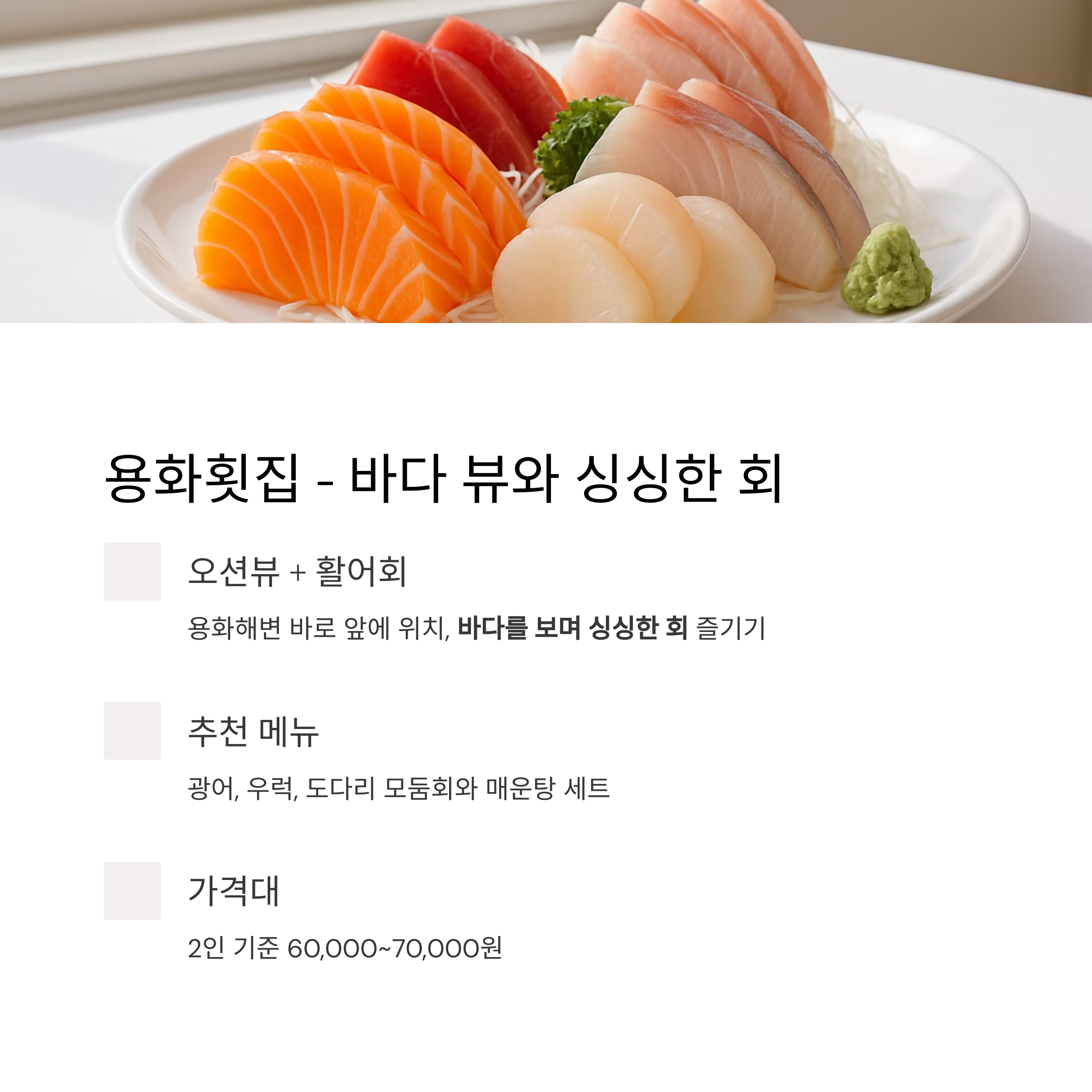 | 용화해변 | 용화횟집 | 모둠회 + 매운탕 | 오션뷰 + 룸 가능 |