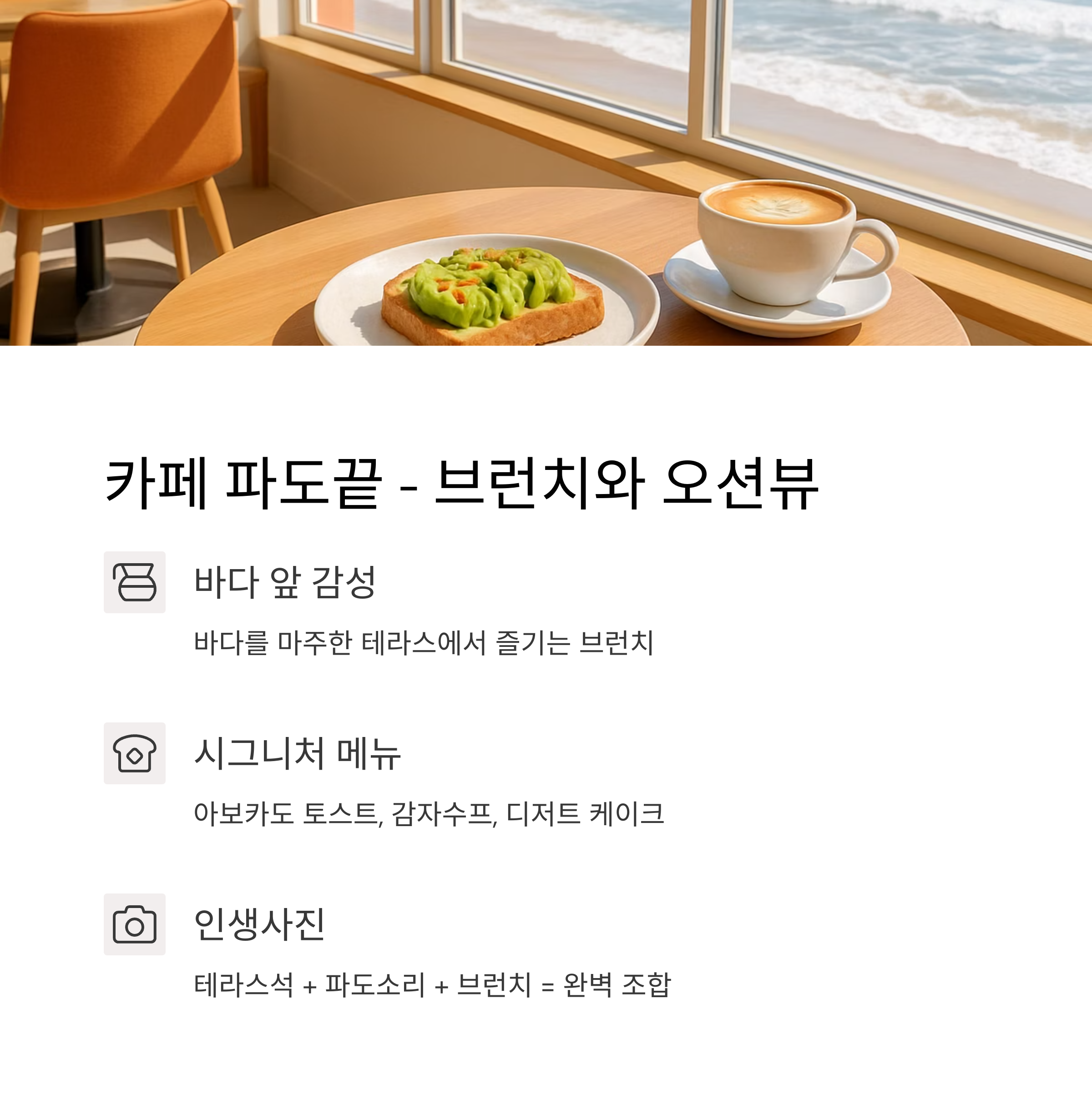 | 포인트 | 테라스석 + 파도소리 + 브런치 = 완벽 조합 |