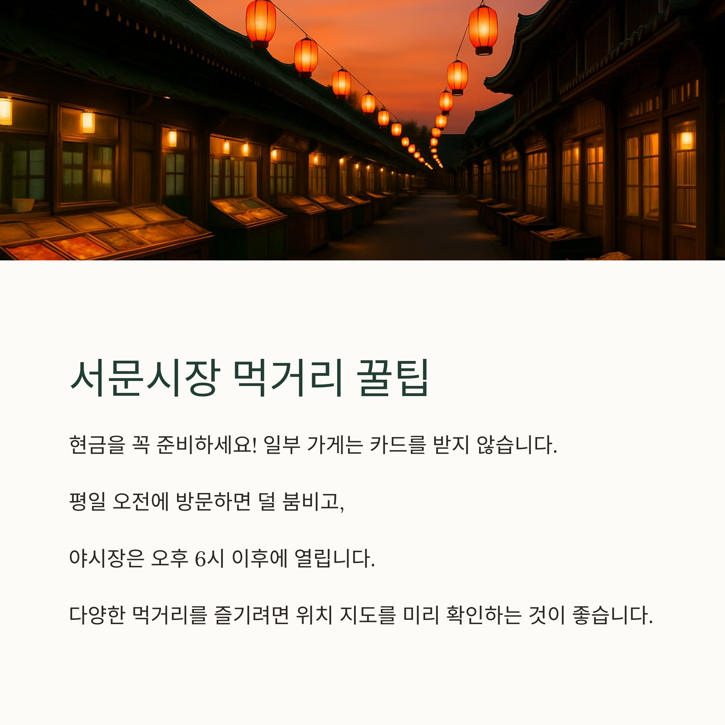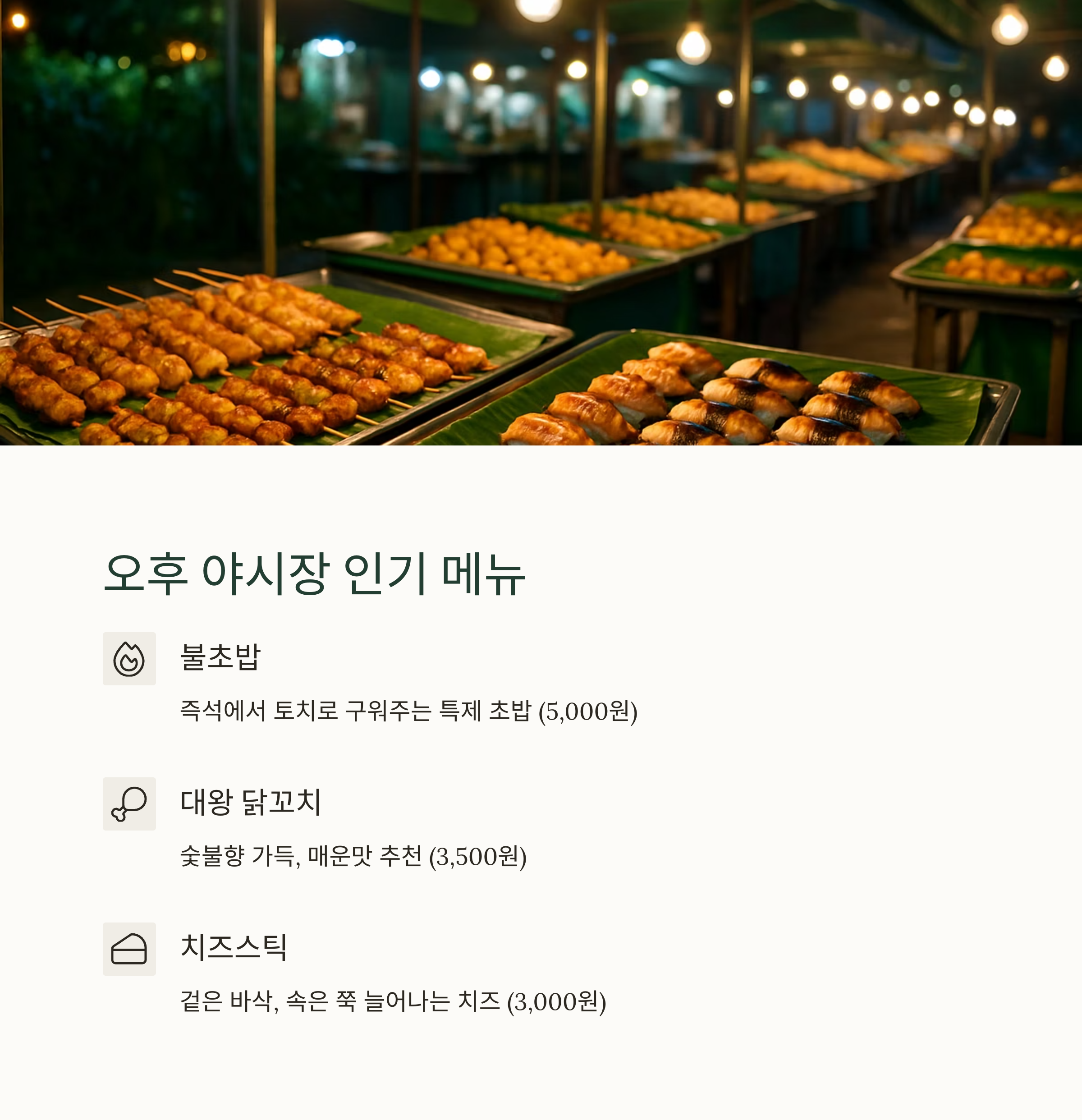 - 팁: 야시장은 오후 6시 오픈. 금·토 방문 추천