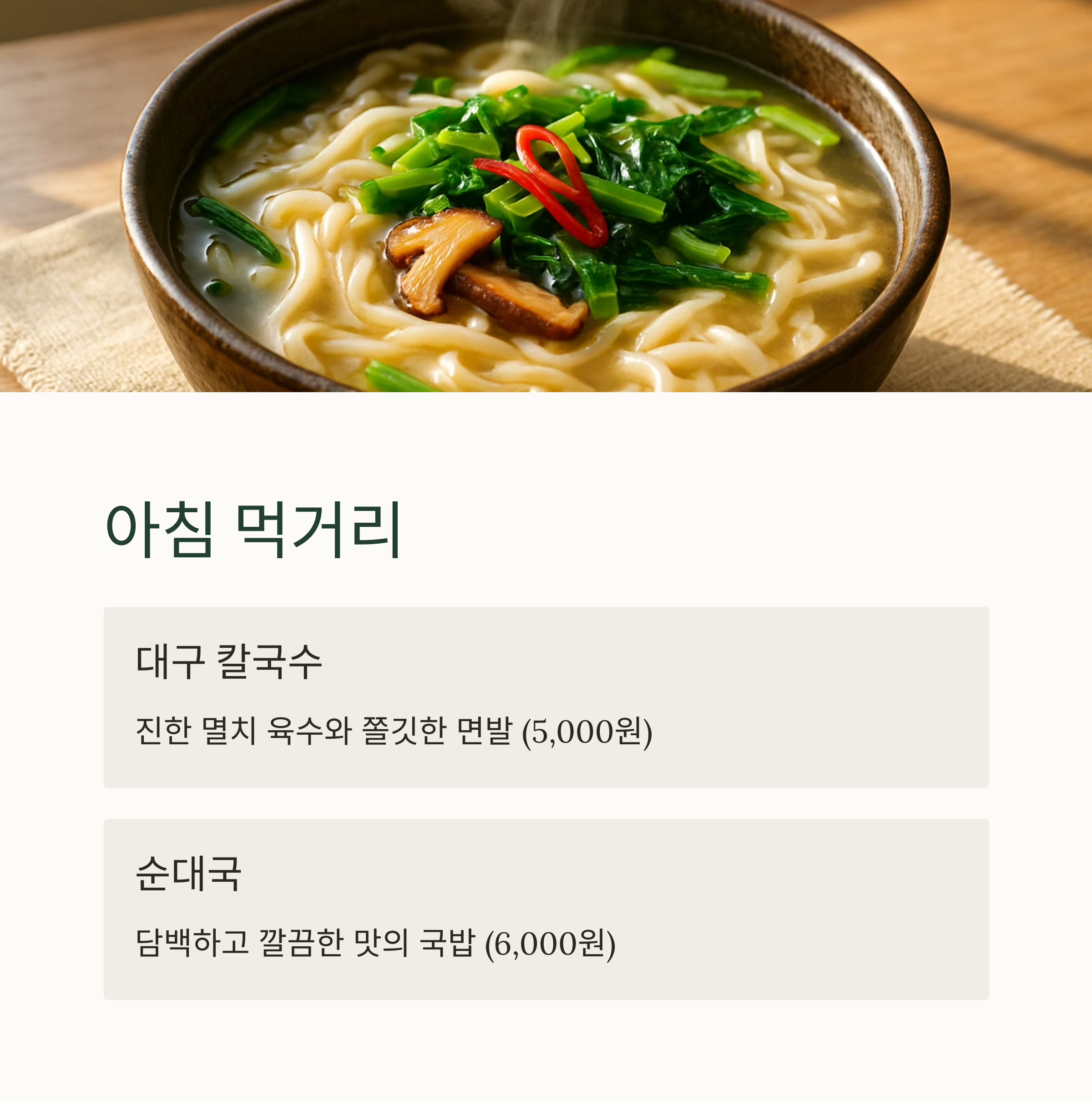 | 오전 9시 | 대구칼국수 | 따뜻한 칼국수 |