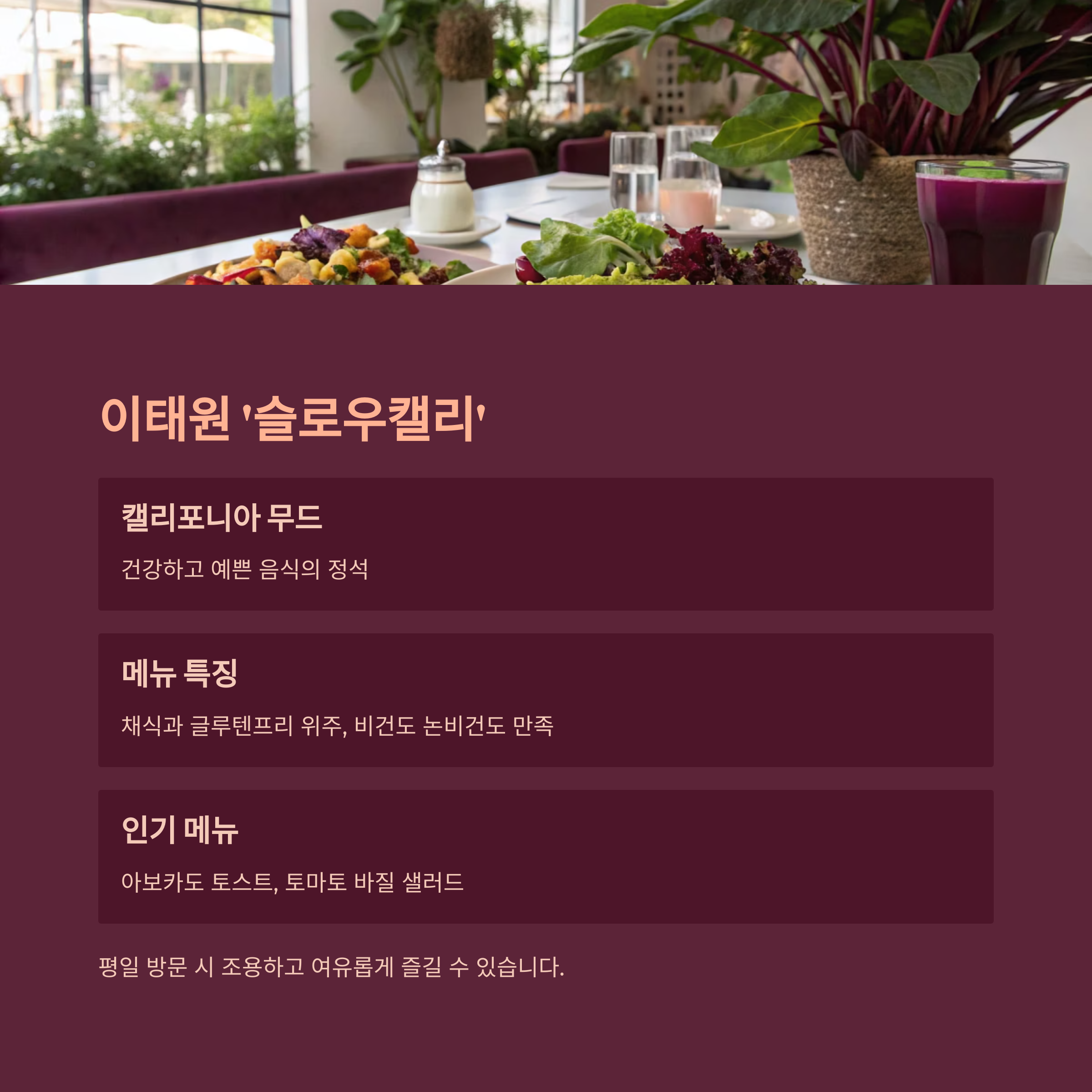 • 인기 메뉴: 아보카도 토스트, 토마토 바질 샐러드