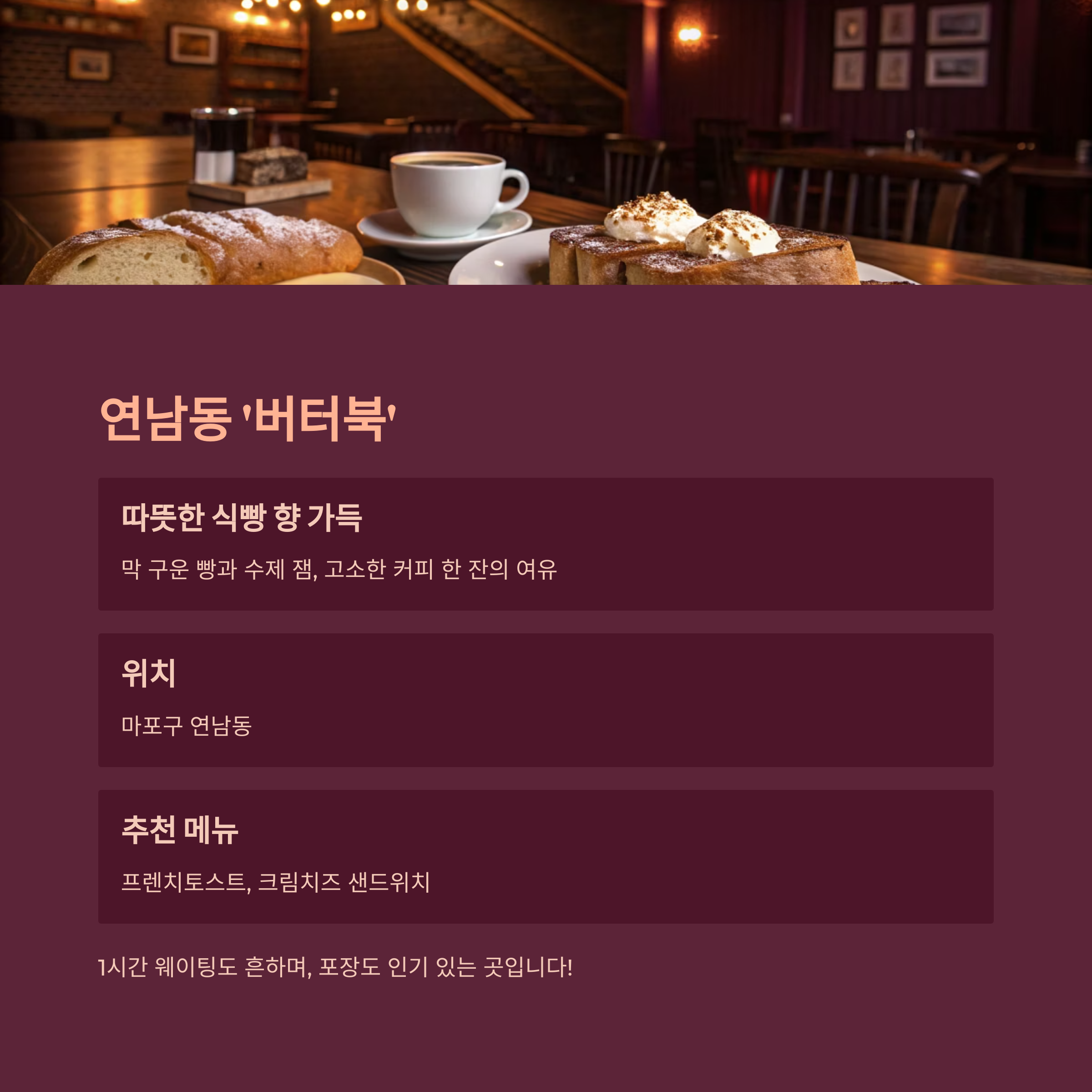 - 오전 10시 → 연남동 '버터북' (식빵 브런치)