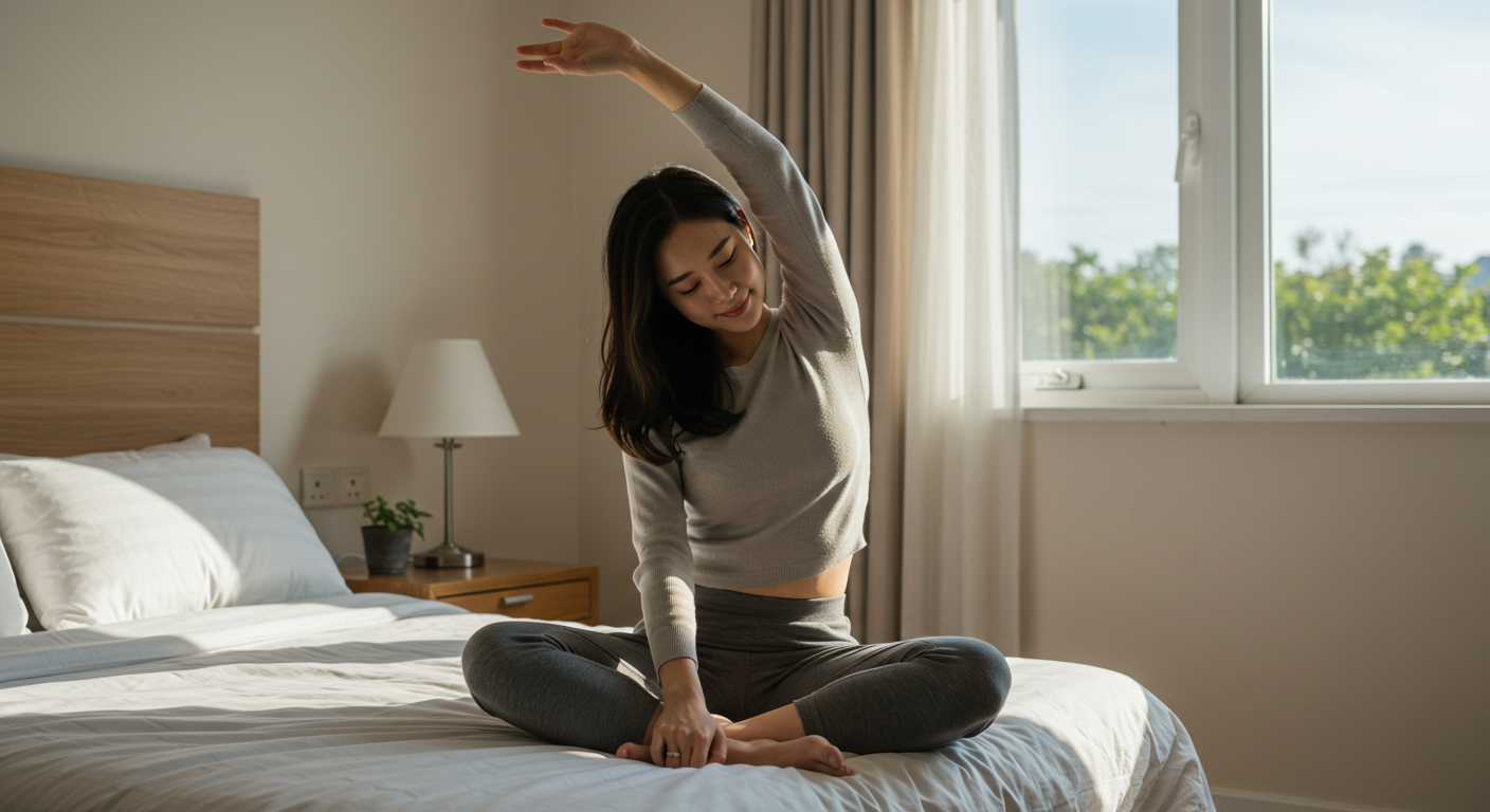 알람이 울리면 침대에서 5분 정도 간단한 스트레칭으로 몸을 깨웁니다. 팔다리를 쭉 펴고 목과 어깨를 가볍게 돌려주는 정도로, 밤새 굳었던 몸을 부드럽게 이완하고 하루를 시작할 준비를 돕습니다.