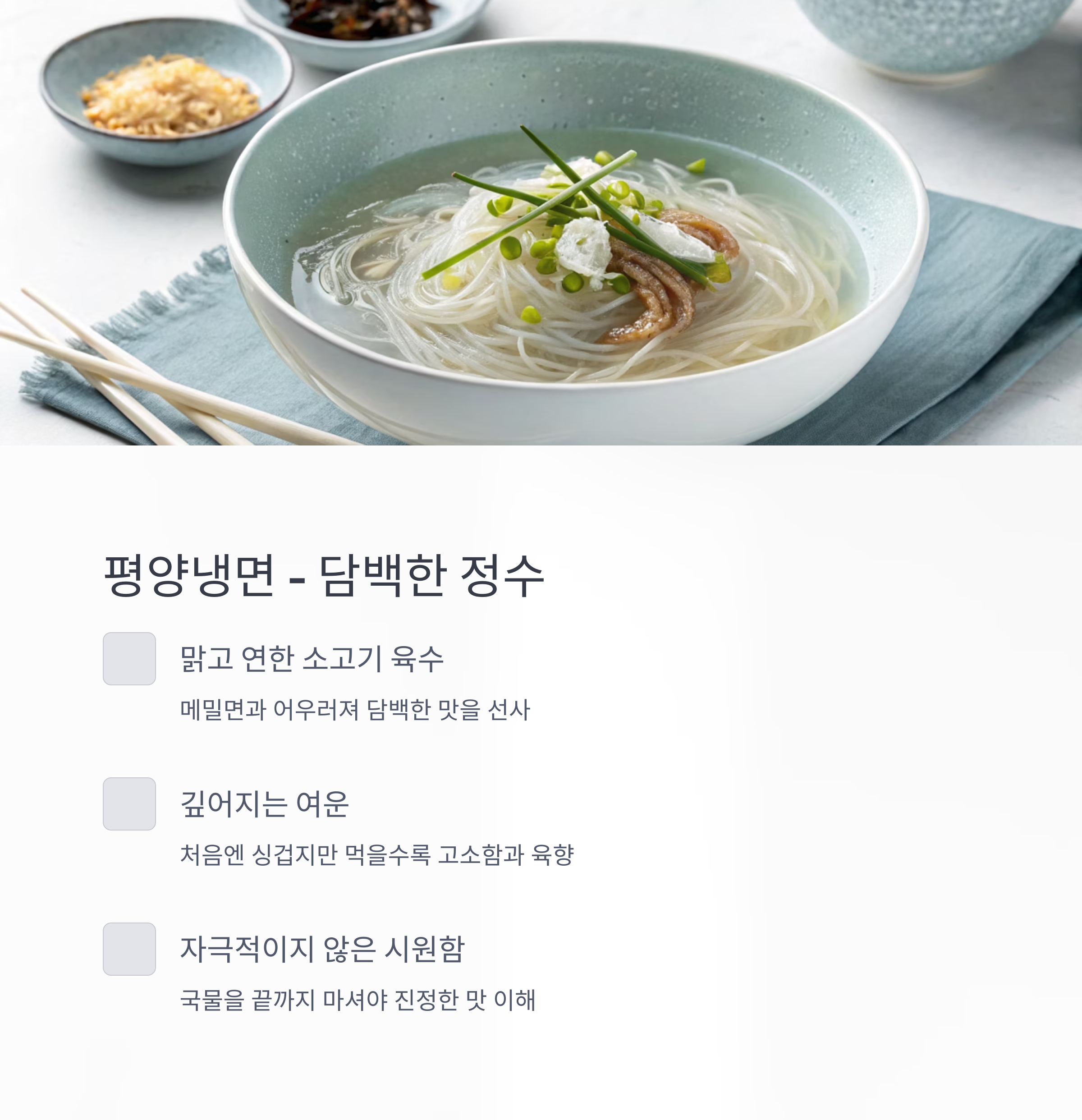 | 평양냉면 | 은은한 육향과 메밀의 조화 | 물냉면 |