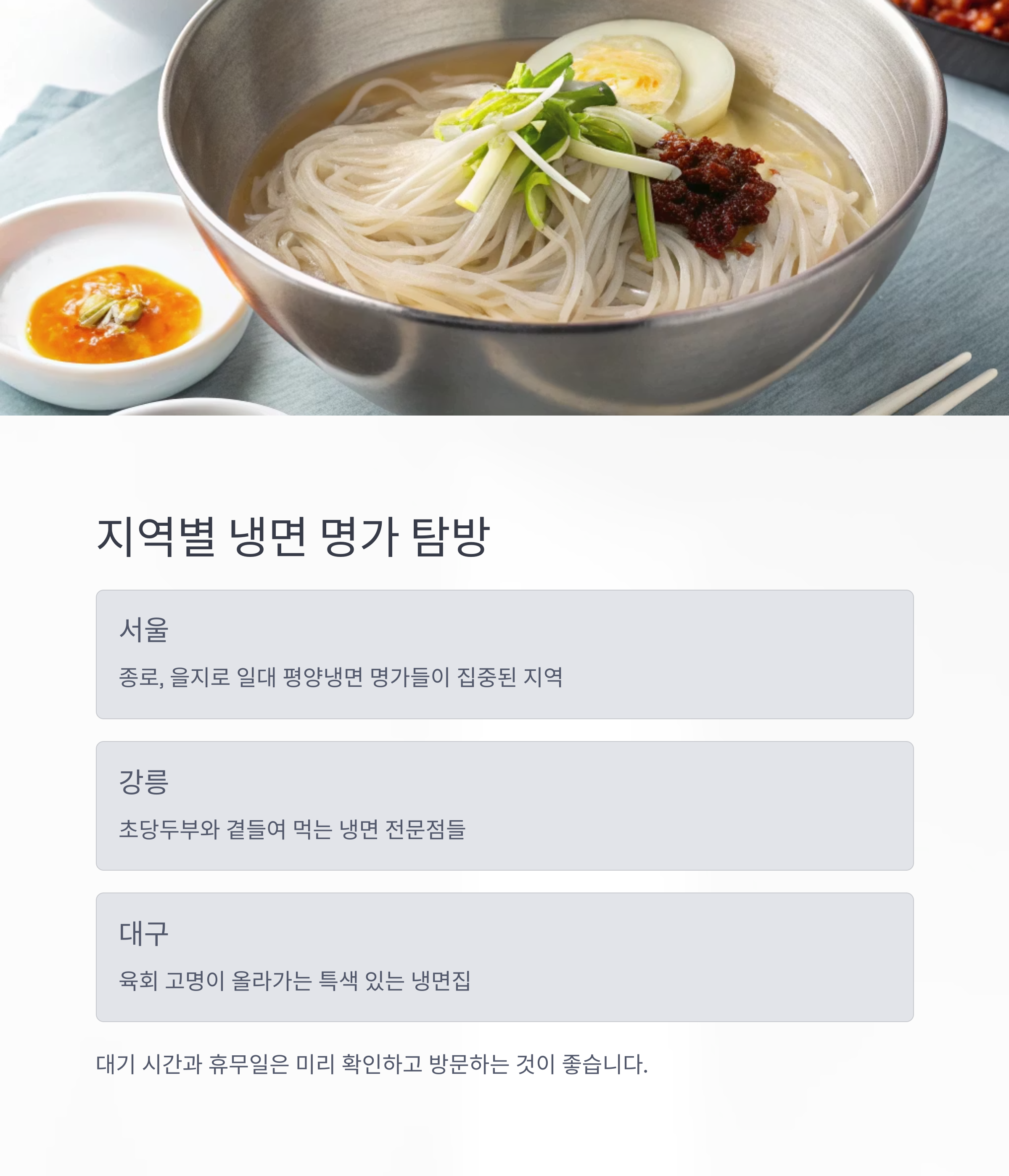 - 서울: 종로, 을지로 일대 평양냉면 명가