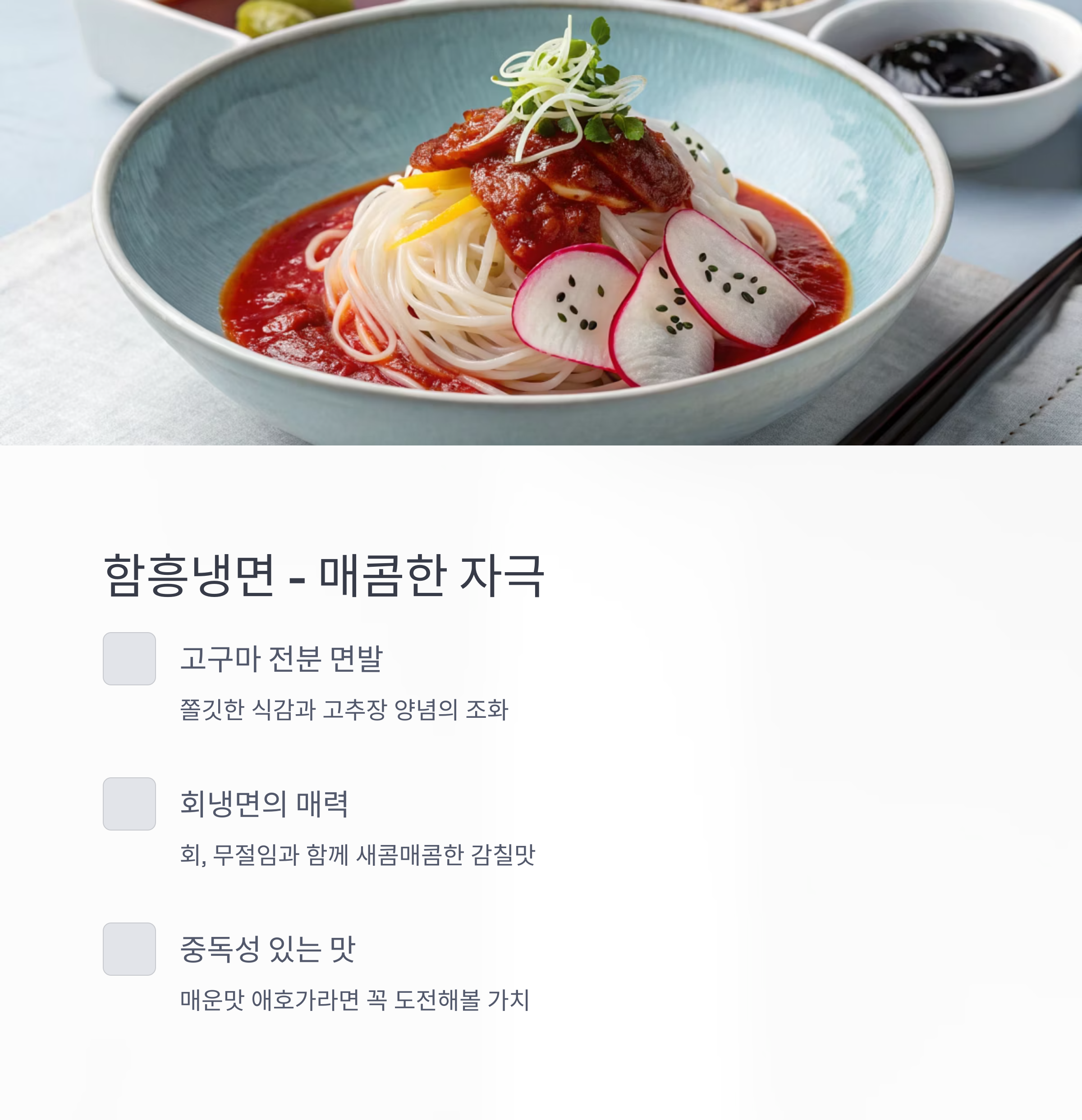 | 함흥냉면 | 매콤한 고추장 양념과 쫄깃한 면발 | 회냉면 또는 비빔냉면 |