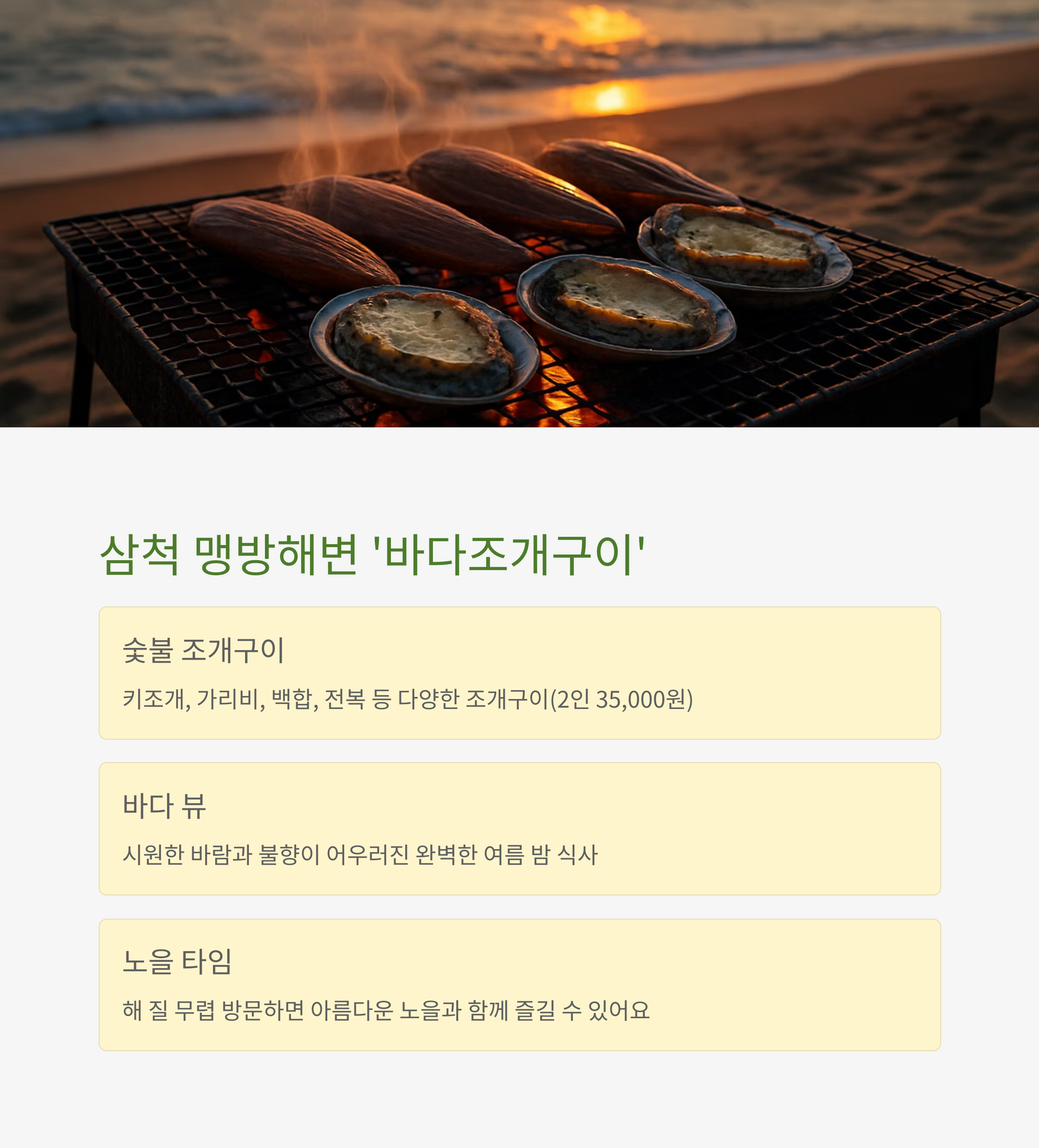 6. 삼척 맹방해변 ‘바다조개구이’ – 바다 뷰 + 숯불 조개구이