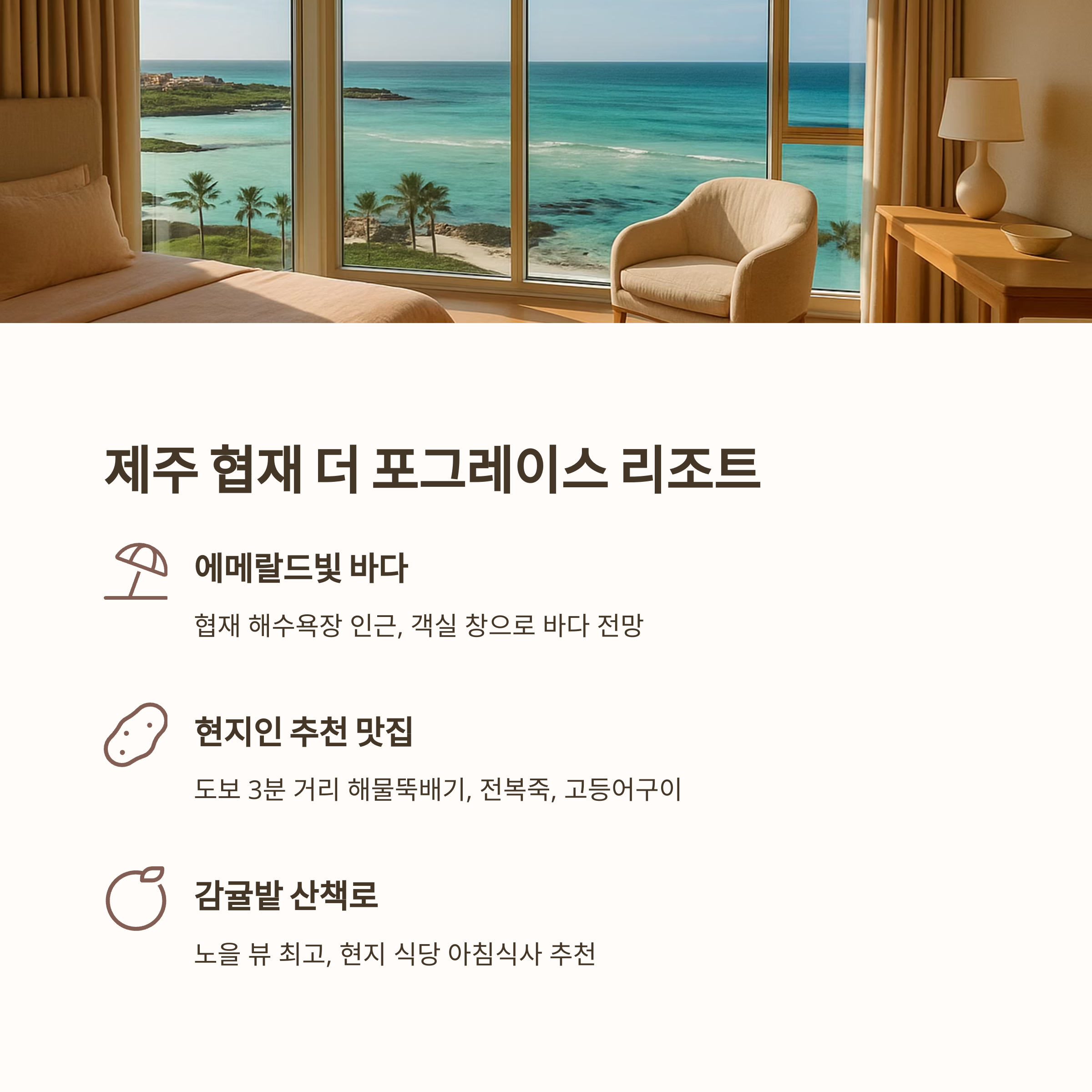 • 숙소 특징: 감귤밭 산책로 + 노을 뷰 최고